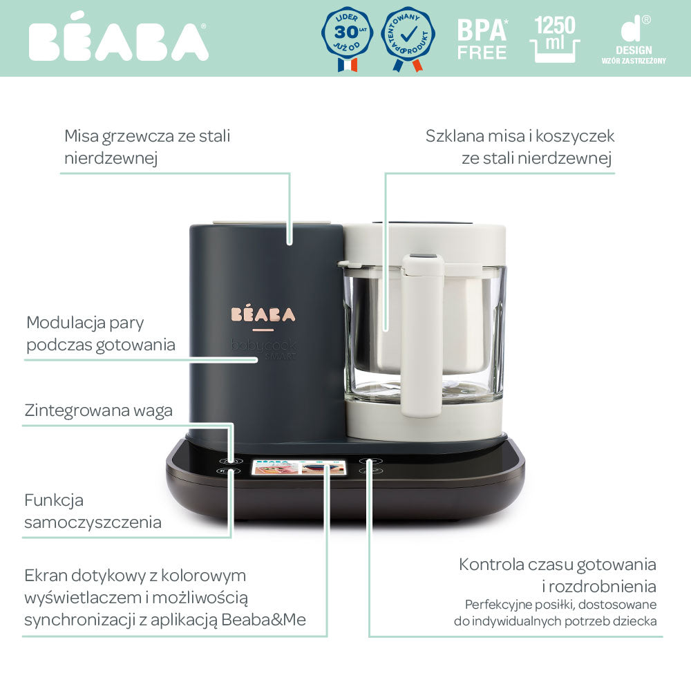Babycook Smart® to innowacyjne, wielofunkcyjne urządzenie kuchenne, które łączy gotowanie na parze, blendowanie, siekanie, podgrzewanie i rozmrażanie z możliwością personalizacji diety dziecka. Dzięki integracji z aplikacją Béaba&Me, robot tworzy indywidualne jadłospisy dopasowane do wieku, alergii, preferencji smakowych oraz etapu rozszerzania diety. To kompletny system żywienia niemowląt i małych dzieci – od pierwszych przecierów po złożone posiłki.