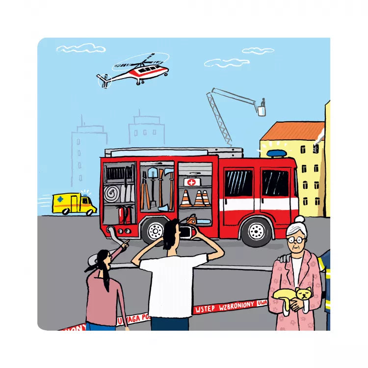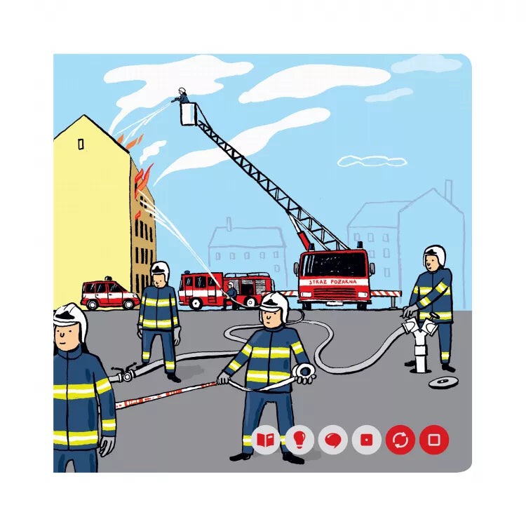 Poznaj kulisy pracy w straży pożarnej! Z tej książki dowiesz się, czego oprócz odwagi, potrzbuje strażak, by wykonywać swoją pracę. Poznamy samochody strażackie, jakich technik używają strażacy i jak zbudują tamę powodziową. W książce są przedstawione sytuacje, w których możesz otrzymać pomoc strażaków. Usłyszysz w niej także nieznane ciekawostki i zagrasz w quizy.