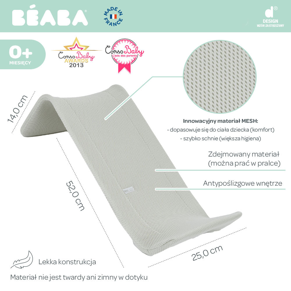 Innowacyjna wkładka - leżaczek do kąpieli niemowląt, francuskiej marki BEABA. Do stosowania od pierwszych dni życia maluszka do momentu, w którym dziecko zacznie samodzielnie siadać. Utrzymana w łagodnej szaro-niebieskiej kolorystyce. Pochylona pozycja odpowiada potrzebom niemowląt – zapewnia wygodę, swobodę ruchów i bezpieczeństwo podczas kąpieli. Leżaczek jest bardzo stabilny, pokryty materiałem MESH, który idealnie dopasowuje się do ciała dziecka, gwarantując mu maksymalny komfort, bez uwierania. Dodatkowo, schnie bardzo szybko, co ułatwia zachowanie higieny. Po włożeniu do wanny, tkanina natychmiast przybiera temperaturę wody, nie jest zatem zimna w kontakcie ze skórą.