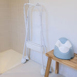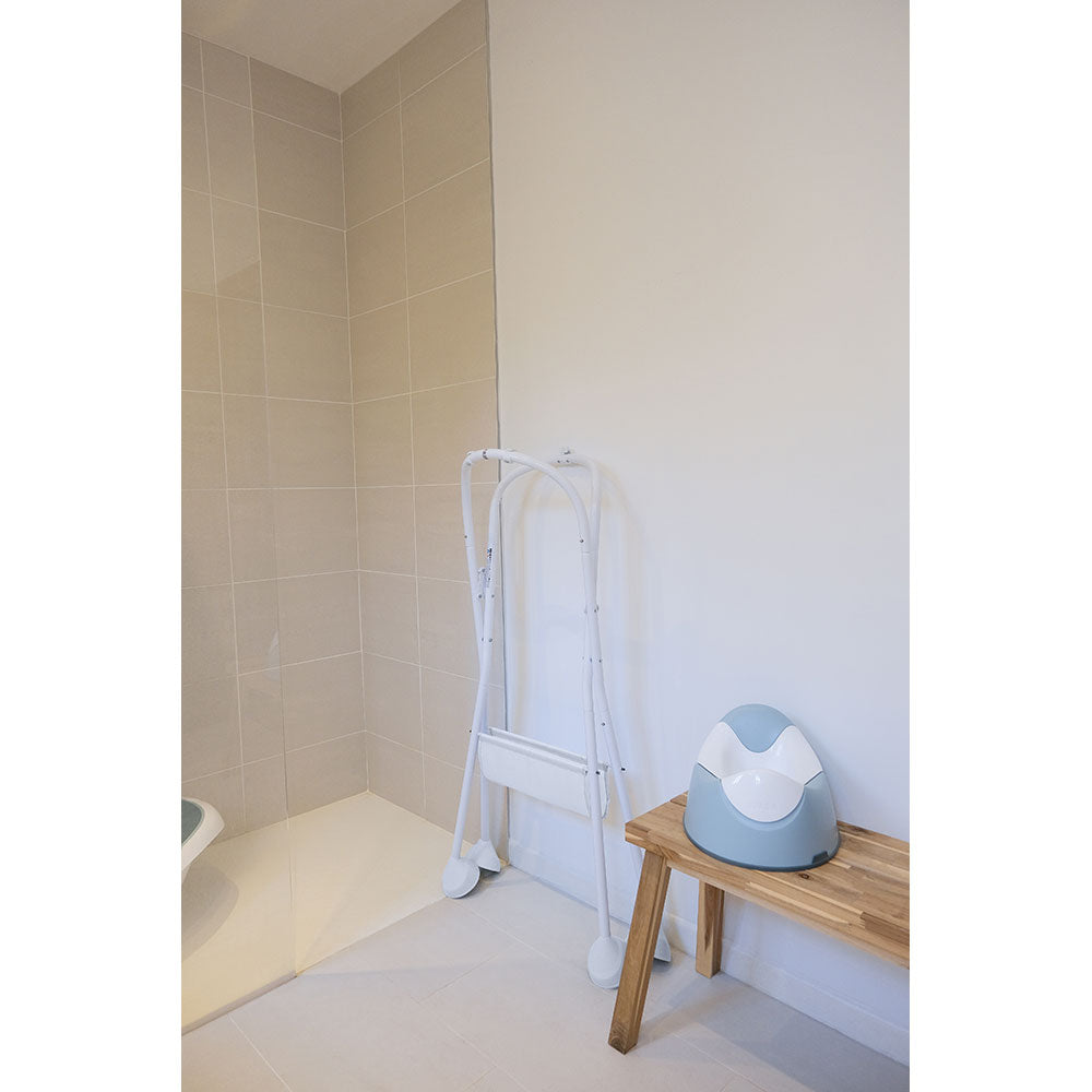 Stojak utrzymany jest w odcieniach bieli, a jego design harmonizuje z całą linią kąpielową BEABA.