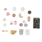 Dzięki drewnianej kawiarence Twoje dziecko może stać się prawdziwym baristą w swoim własnym domu. Ten uroczy zestaw pozwoli Wam stworzyć ulubioną kawiarnię bez wychodzenia z domu. Twoje dziecko z przyjemnością będzie przygotowywać pyszne napoje i ciasteczka na miejscu lub na wynos. W kąciku kawowym znajduje się ekspres do kawy i herbaty, schowek na kubki i inne niezbędne artykuły, witryna na przekąski oraz tablica z menu. Liczne akcesoria, takie jak rogaliki, pączki, torebki z herbatą i różne rodzaje kawy, zapewnią wiele godzin wspaniałej zabawy.
