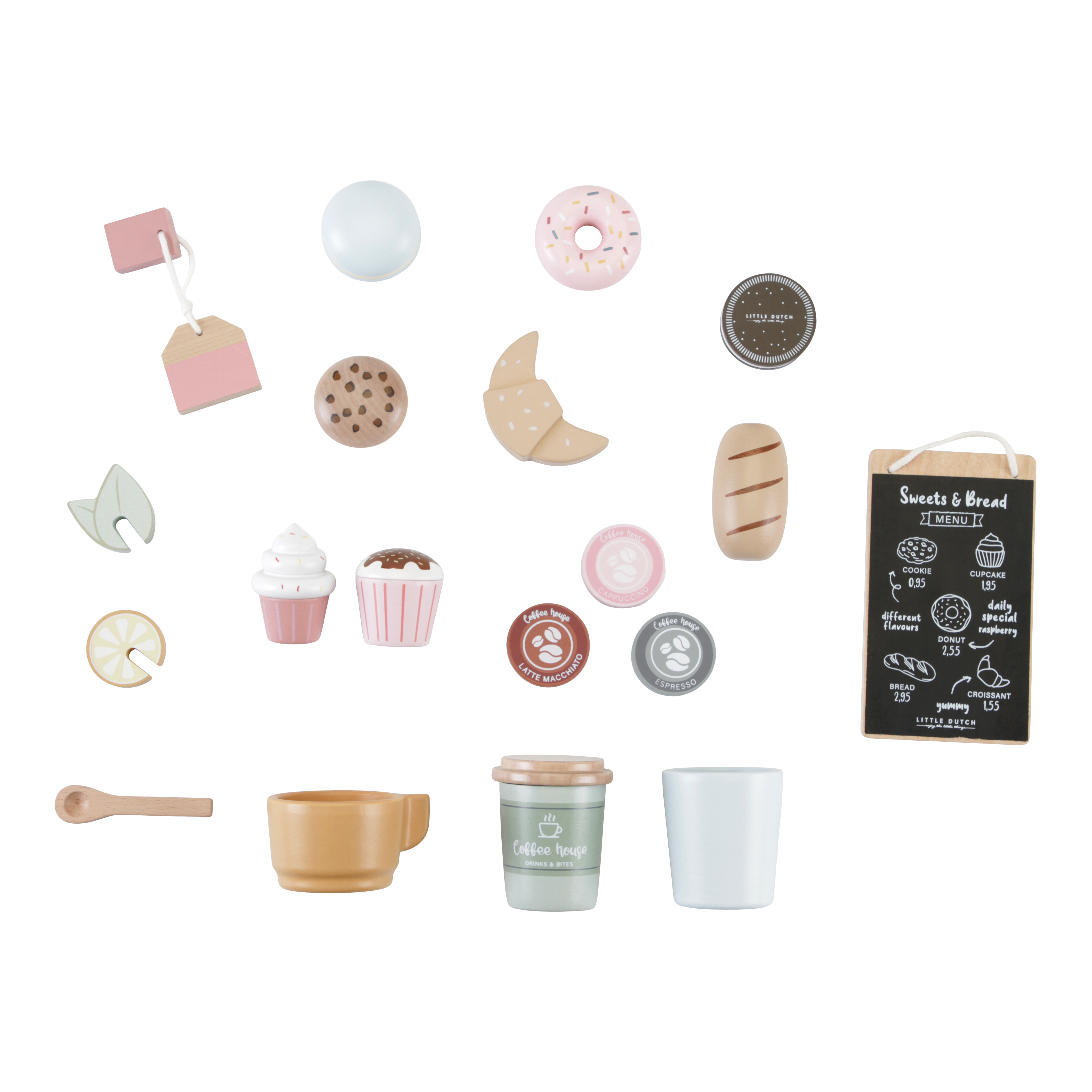 Kawiarenka i wszystkie akcesoria (19 sztuk) wykonane są z drewna z certyfikatem FSC i pokryte bezpieczną farbą na bazie wody w uroczych, pastelowych kolorach. Zabawka pobudza kreatywność i zdolności motoryczne oraz pozwala dzieciom uwolnić wyobraźnię. Świetnie sprawdzi się jako uzupełnienie do Dużej kuchni pastelowej, Dużego drewnianego tortu urodzinowego lub Tostera z akcesoriami. Kawiarenka to doskonały pomysł na prezent dla każdego trzylatka.