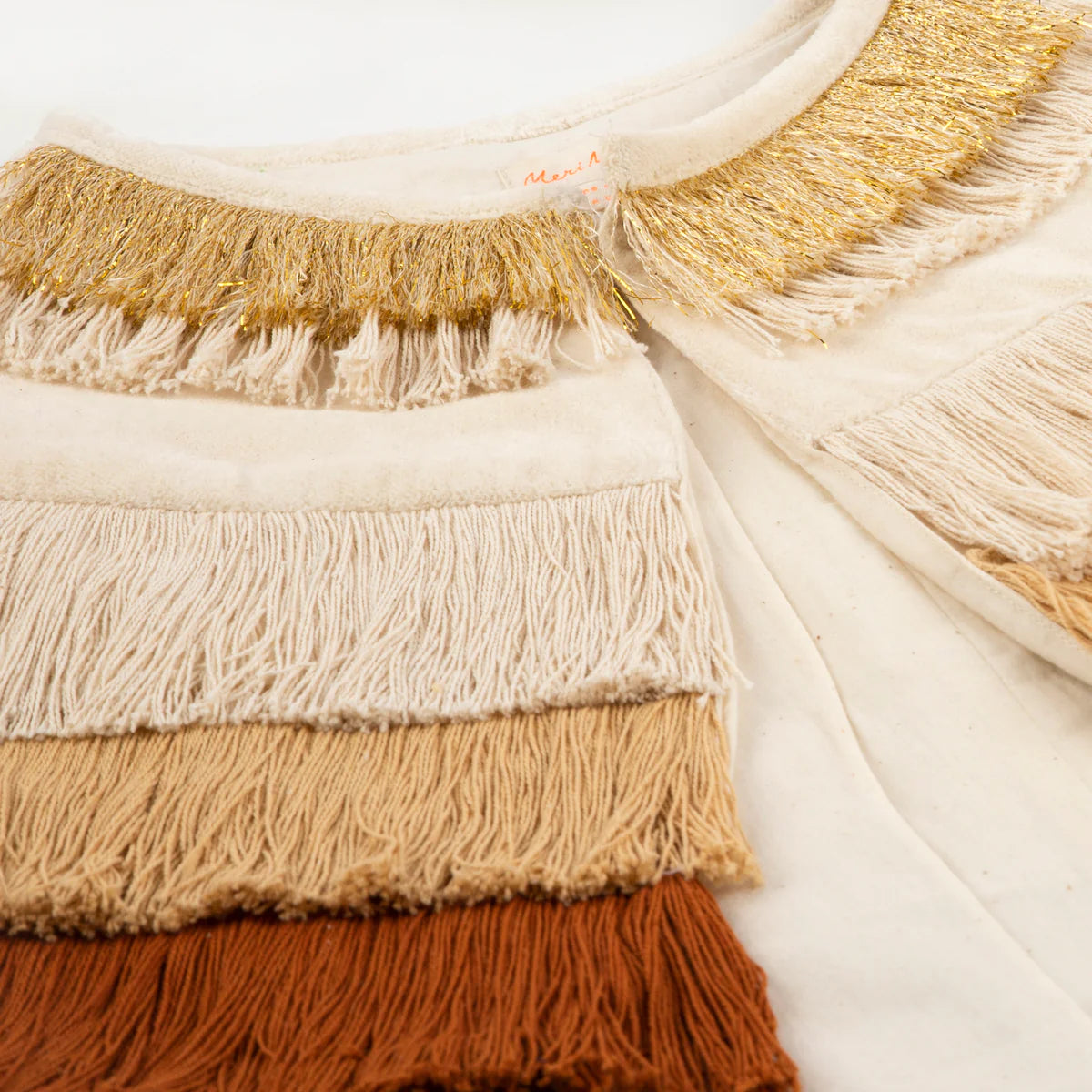 • Peleryna wykonana z kremowego polibawełnianego materiału, ozdobiona frędzlami bawełnianymi, złotymi frędzlami oraz aksamitnym kremem