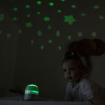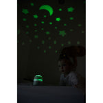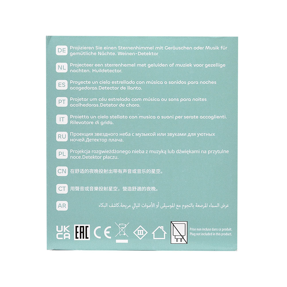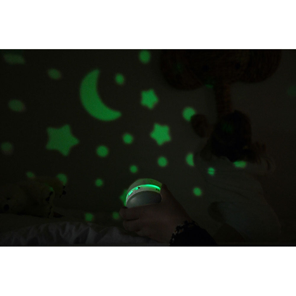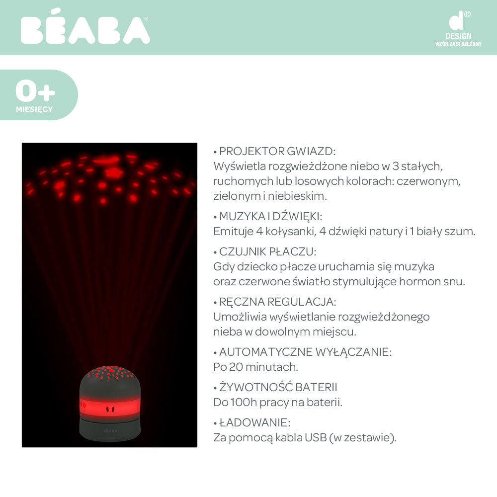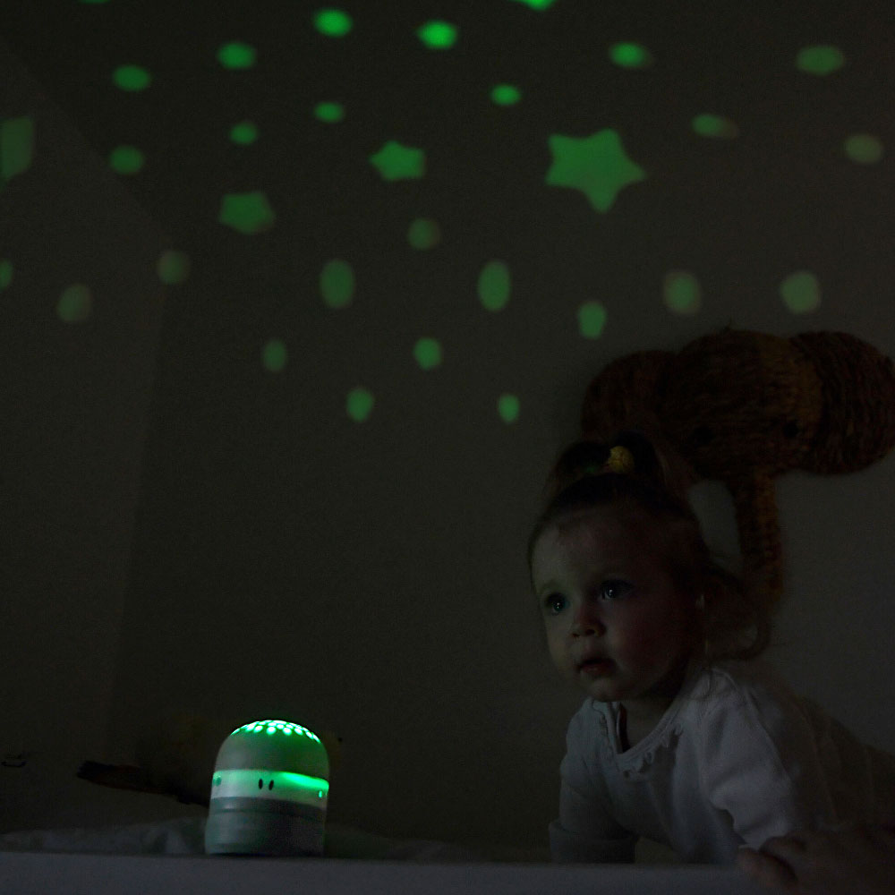 Urządzenie oferuje 9 wbudowanych dźwięków: 4 kołysanki, 4 odgłosy natury (takie jak szum fal, deszcz czy śpiew ptaków) oraz biały szum, które wspierają wyciszenie i ułatwiają zasypianie. Jedną z praktycznych funkcji projektora jest czujnik płaczu – w momencie, gdy dziecko zaczyna płakać, urządzenie automatycznie się włącza, emitując czerwoną projekcję i łagodną muzykę, co wspomaga ponowne zaśnięcie m.in. poprzez stymulację wydzielania hormonu snu.