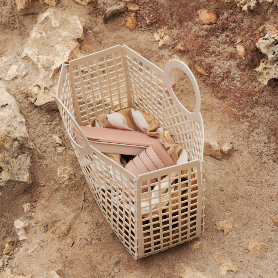 Koszyk Bloom marki Liewood to idealne rozwiązanie do przechowywania zabawek plażowych, muszelek i innych skarbów. Jego funkcjonalność sprawia, że łatwo się składa i rozkłada (na płasko), co czyni go doskonałym towarzyszem podróży - zmieści się w każdej walizce wakacyjnej. Ponadto, może być również wykorzystywany w domu jako praktyczny schowek na zabawki i książki czy podczas codziennych zakupów.
