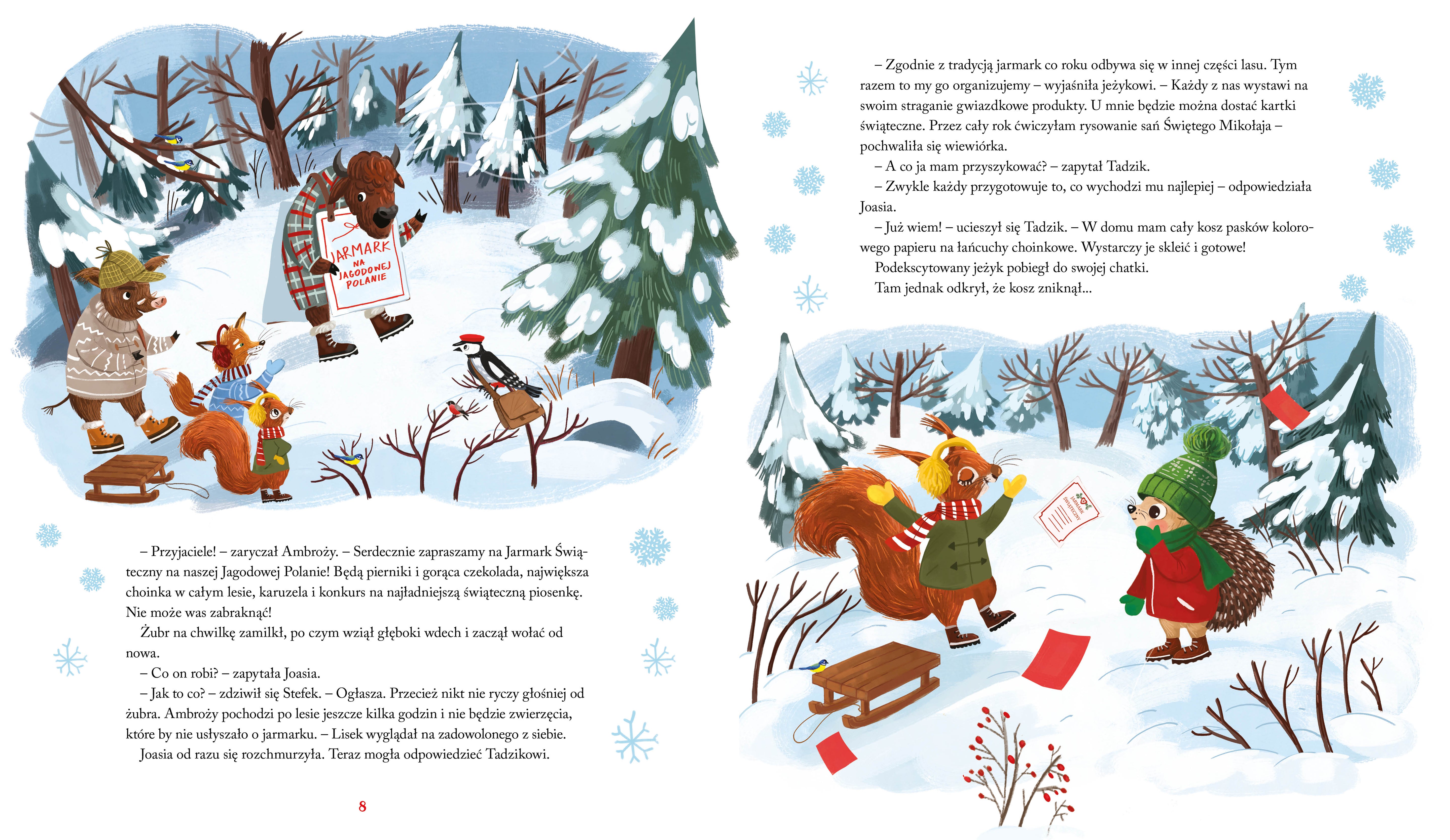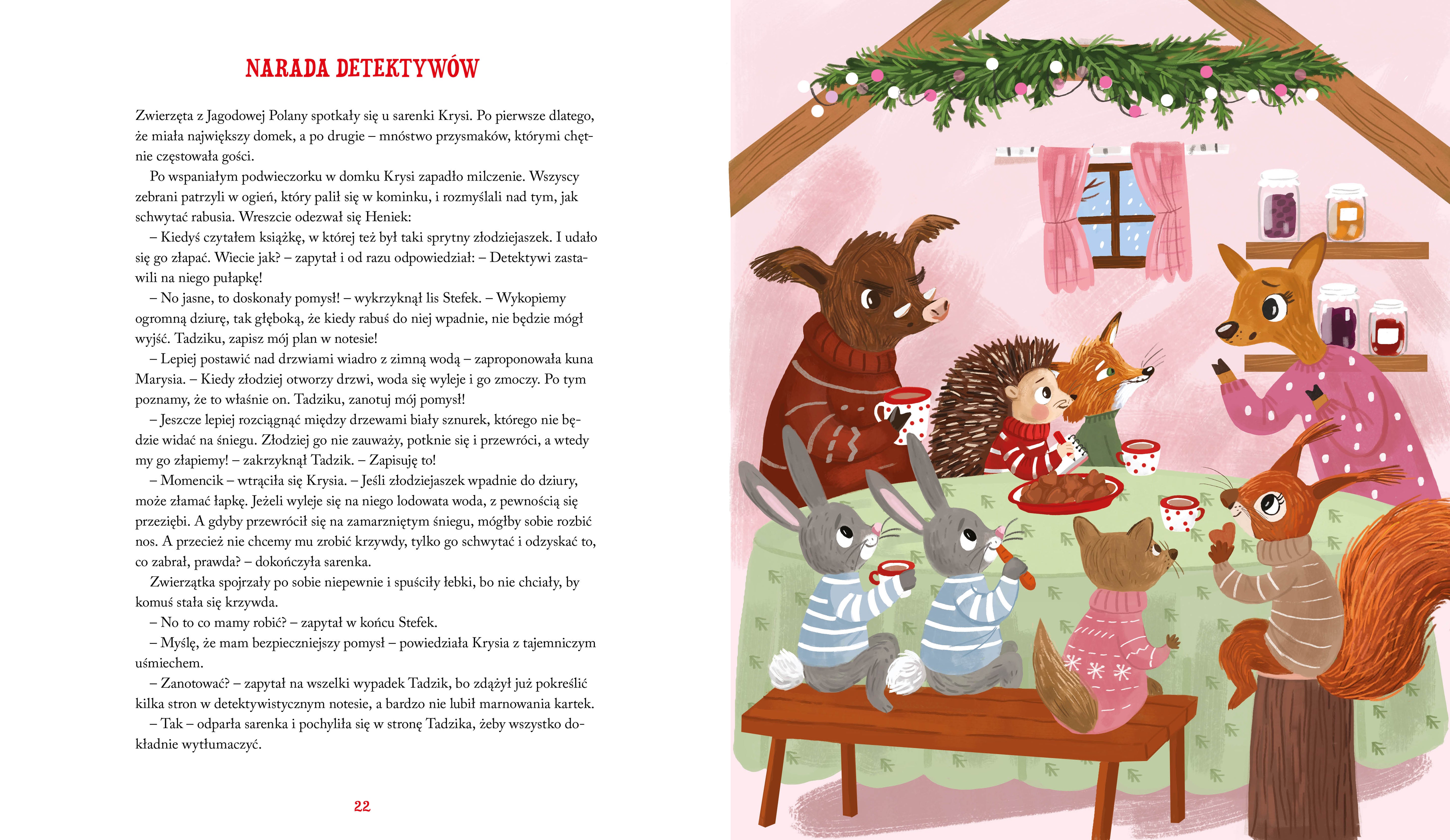 Ale… Nagle zaczynają znikać różne potrzebne rzeczy - a to papier kolorowy, a to książka kucharska… Czyżby na Jagodowej Polanie grasował złodziejaszek? Na poszukiwanie zaginionych przedmiotów rusza leśny patrol detektywistyczny. Oby tylko detektywom udało się schwytać sprytnego rabusia, zanim nadejdą Święta!