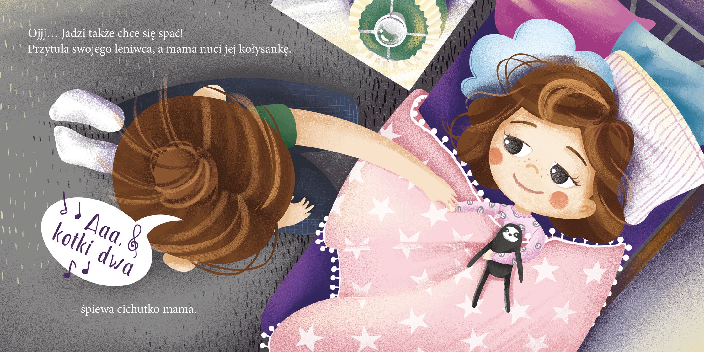 Wszystkie leniwce na piżamce małej Jadzi już ziewają ze zmęczenia, tylko Jadzia jakoś nie chce iść spać. Jest jednak na to pewna rada - mama Jadzi zna sztuczki, które pomogą dziewczynce zapaść w puchaty i milutki jak kocyk sen. Co to za magia?