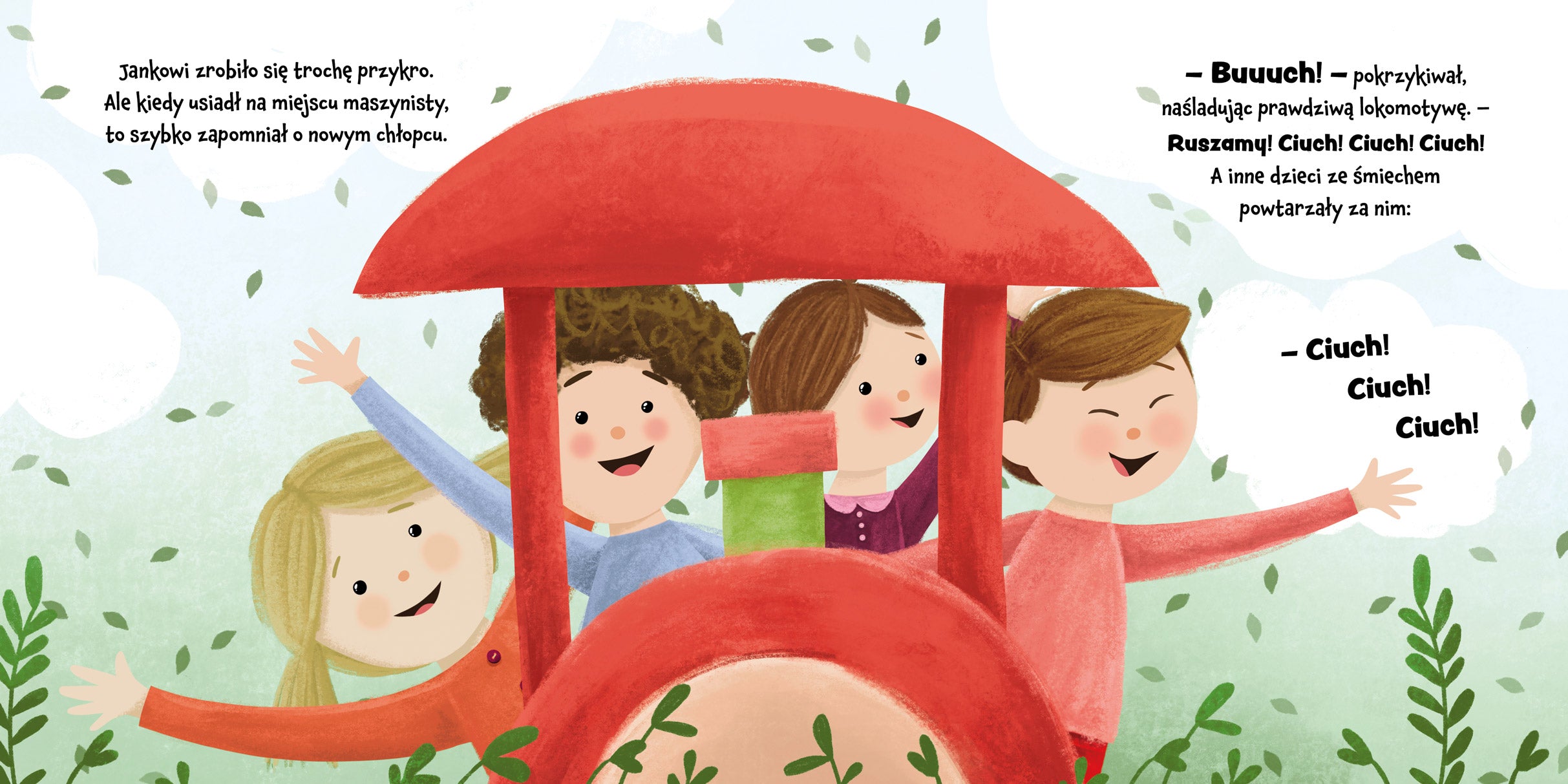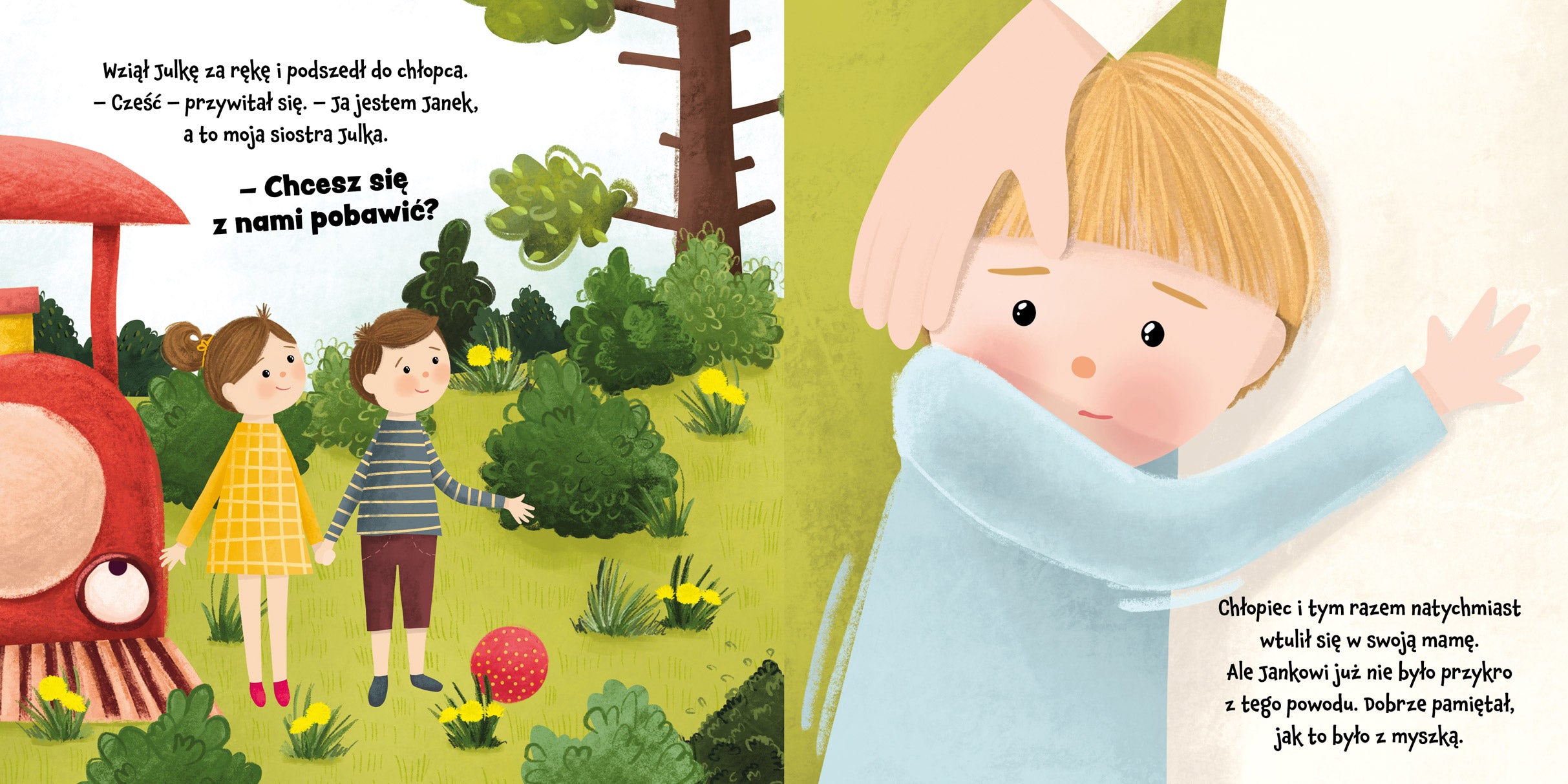 Na placu zabaw rodzeństwo spotyka nowego chłopca. Janek od razu zaprasza go do zabawy, jednak chłopiec chowa się za swoją mamę. Janek jest zdziwiony jego zachowaniem. Po powrocie do domu mama tłumaczy bliźniakom, czym jest nieśmiałość. Kolejnego dnia, gdy nowy chłopiec ponownie zjawia się na placu zabaw, Janek daje mu czas, aby patrzył, jak się bawią. W końcu Kuba decyduje się dołączyć do dzieci.
