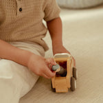 Autko zostało wykonane z drewna pomalowanego bezpiecznymi farbami na bazie wody, dzięki czemu jest w pełni przyjazne dla dzieci. Zaokrąglone kształty i kompaktowy rozmiar sprawiają, że taksówka idealnie mieści się w małych rączkach i wspiera rozwój motoryki małej.