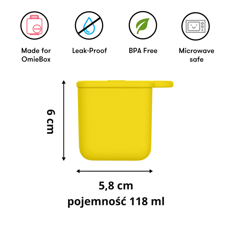 OmieDip został specjalnie zaprojektowany tak, by pasować do podłużnych przegródek w śniadaniówce dla dzieci Omiebox. Sam również może być wykorzystywany jako dodatkowa przegródka, pozwalająca oddzielić poszczególne składowe posiłku - wystarczy, że nie umieścisz na nim pokrywki.