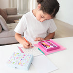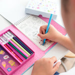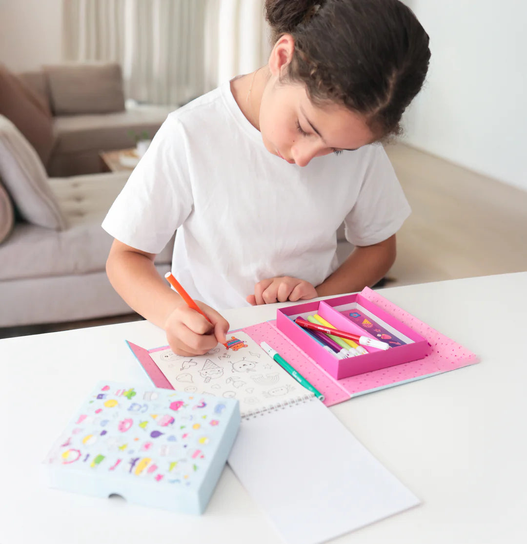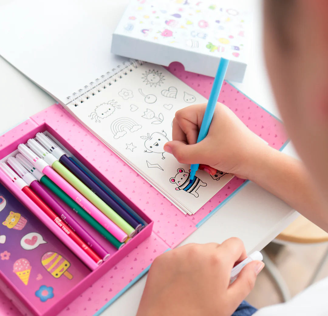 Masz w domu małego fana naklejek? Ten kompaktowy zestaw od Tiger Tribe zapewni długie godziny twórczej frajdy – czy to w domu, czy w podróży. W środku znajdziesz 16-stronicowy notatnik z naklejkami do kolorowania, 3 gotowe arkusze kolorowych naklejek, w tym naklejki z brokatem, oraz 10 kolorowych mazaków.
