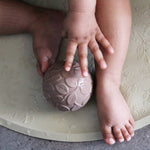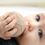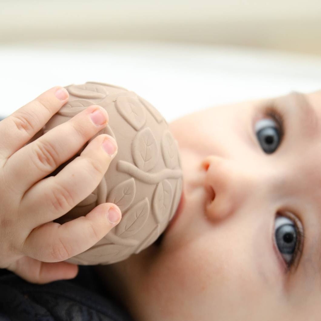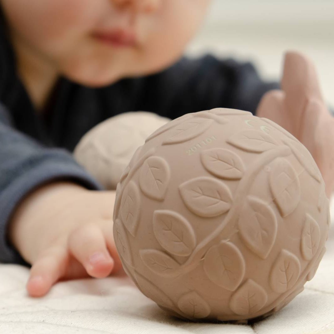 Ręcznie wykonane piłeczki sensoryczne z dzwoneczkiem w naturalnych barwach, stworzone w 100% z naturalnego kauczuku.