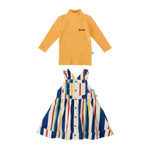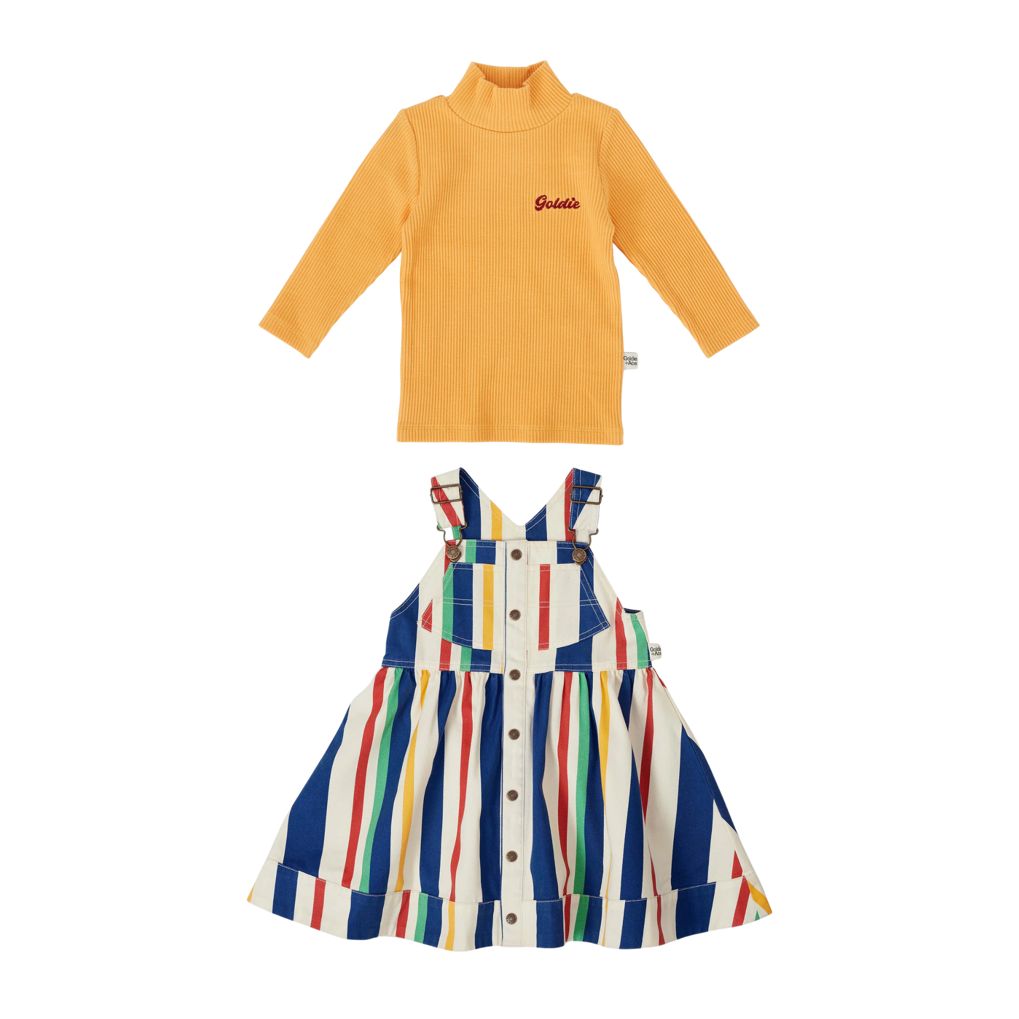 Zestaw Goldie + Ace - Dziewczęca bluzka prążkowana z haftem i golfem + Sukienka ogrodniczka Heidi – paski retro