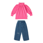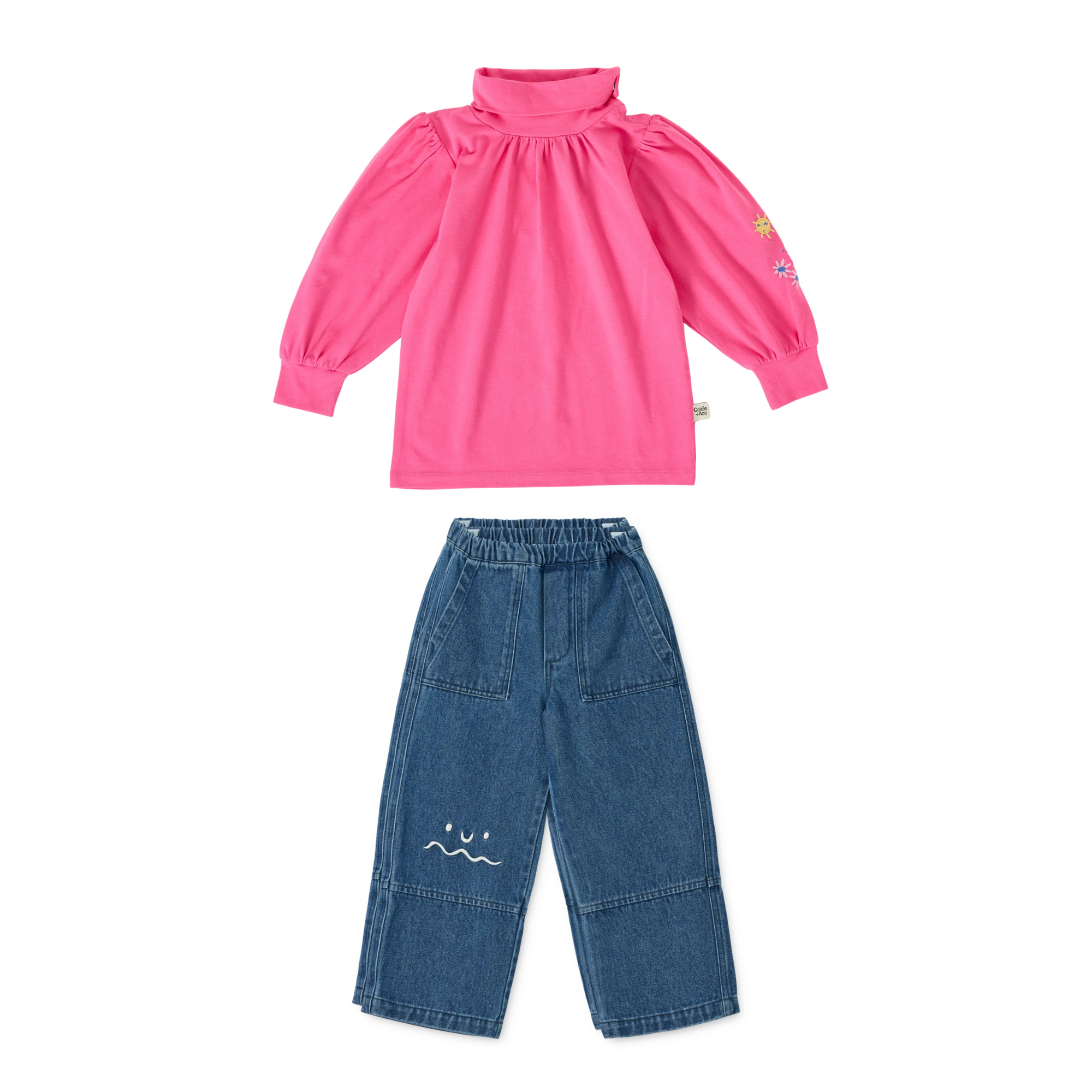 Elegancja na co dzień w połączeniu z nutą retro stylu! Ten zestaw łączy uroczą dziewczęcą bluzkę z bufiastymi rękawami i haftowanym detalem z wygodnymi, szerokimi jeansami. Razem tworzą komplet, który świetnie sprawdzi się w przedszkolu, szkole, na rodzinnych wyjściach czy bardziej wyjątkowych okazjach.