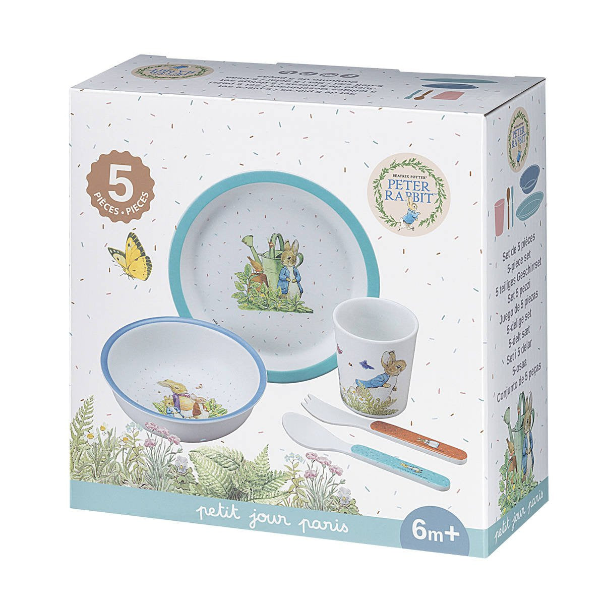 Petit Jour Paris - Zestaw naczyń i sztućców dziecięcych 5 el. Królik Piotruś niebieski