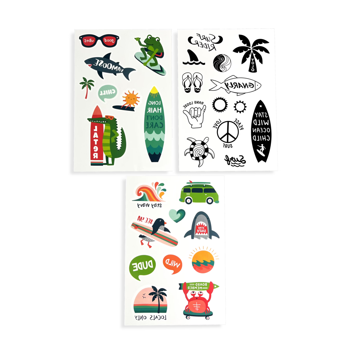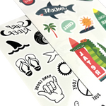 To jest to! Super plażowy trend. Bądź na fali i przyozdób swój look zmywalnymi tatuażami z motywem plaży! W zestawie znajdują się trzy arkusze tatuaży – dwa kolorowe i jeden czarno-biały. Są one nietoksyczne, trwałe i mają super moc — mogą zamienić deszczowe popołudnie w dzień na plaży! Te tymczasowe tatuaże dla dzieci oddają letnią atmosferę wakacji nad morzem! Popatrz na te zabawne motywy jak np. serfujące słońce, albo żaba, w tym zestawie chodzi o dobry nastrój i zabawę! Plaża to Twoje ulubione miejsce? Wróć na nią razem z tymi zabawnymi wzorami!