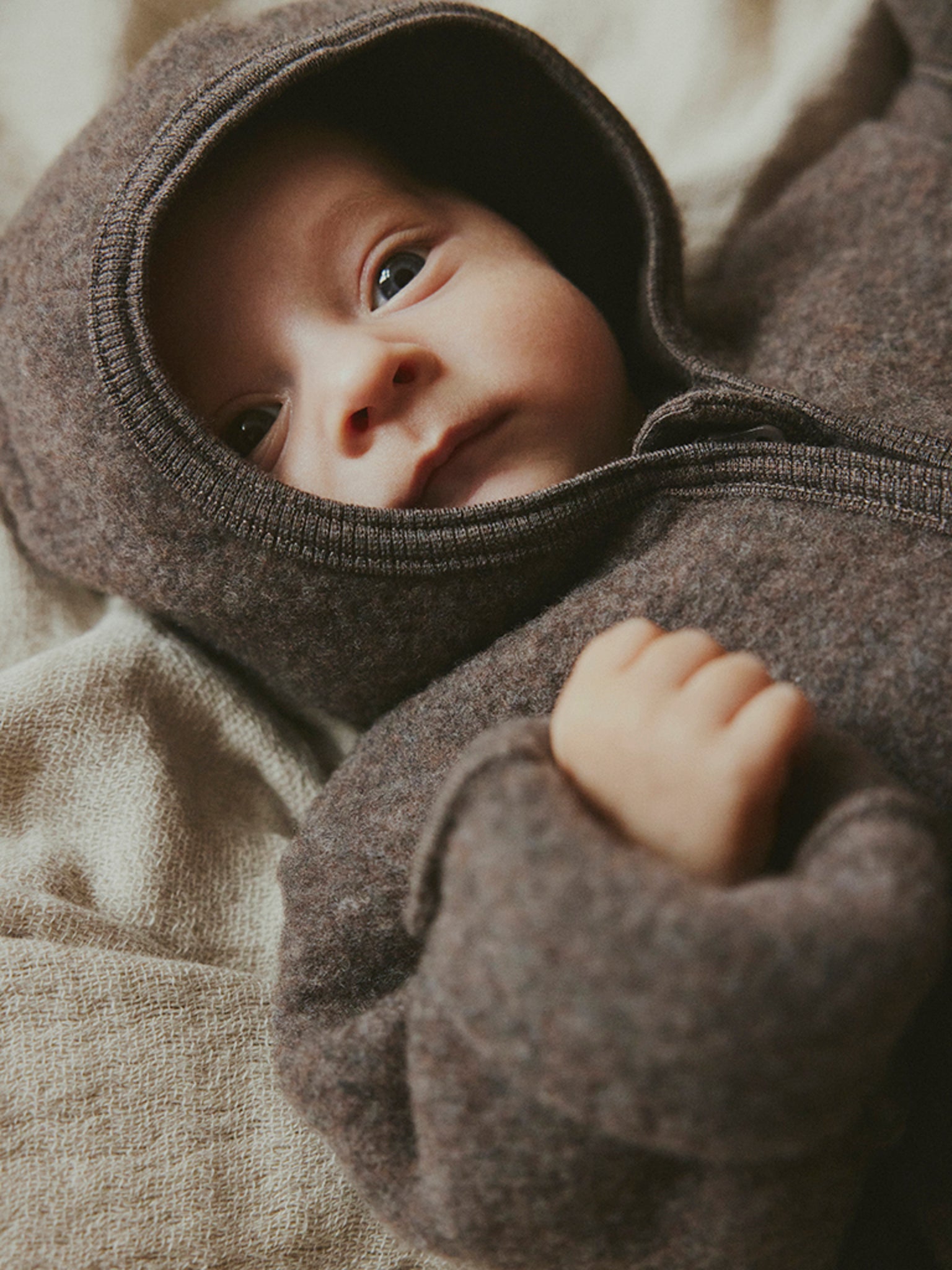 Wełniany kombinezon niemowlęcy HUTTEliHUT Pram Suit to idealna ochrona przed chłodem w jesienne i zimowe dni. Uszyty z najwyższej jakości wełny merino, łączy w sobie naturalne właściwości termoizolacyjne i oddychające, dzięki czemu maluszek zawsze ma zapewniony komfort cieplny bez przegrzewania.