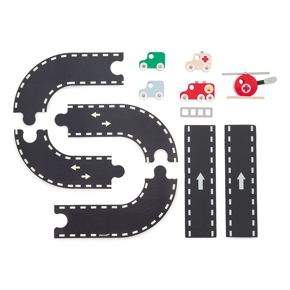 Drewniana remiza z serii Bolid francuskiej marki JANOD to idealny prezent dla każdego dziecka. Komplet składa się z kilkupoziomowej (3 kondygnacje!) remizy wraz z akcesoriami: 2 autami, wozem strażackim, karetką i helikopterem. Budynek posiada dwa podjazdy, mechaniczną windę (na koło zębate) oraz lądowisko dla helikopterów. Na łączącej piętra rurze znajdują się dwie figurki strażaków (niezdejmowane), które puszczone z góry zsuwają się w dół ruchem obrotowym.