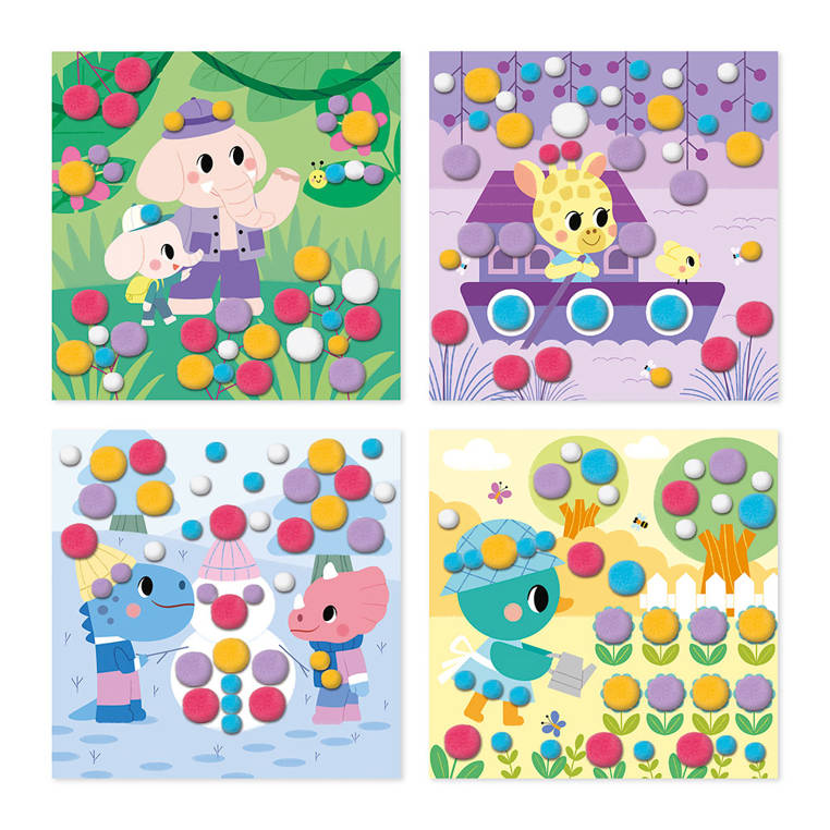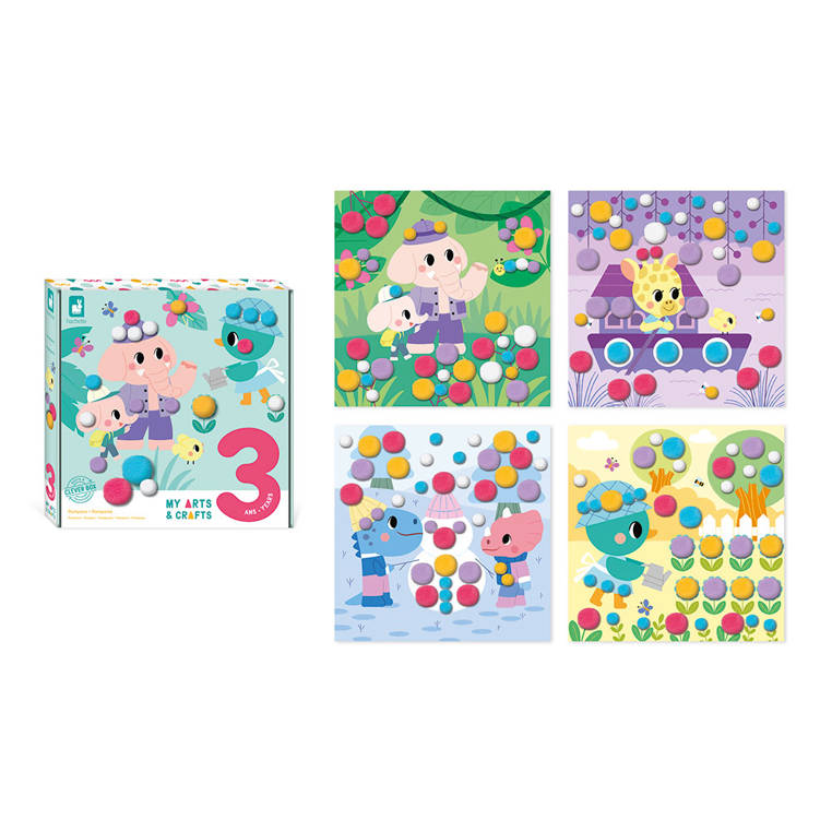 Zestaw kreatywny Pompony francuskiej marki JANOD zawiera 4 plansze-obrazki, przedstawiające różne zwierzątka w nietypowych sytuacjach: płynące łodzią żyrafy, podlewającą rabatę kaczuszkę, budujące bałwana dinozaury oraz słonie na wycieczce w lesie. Ilustracje te można ozdobić, naklejając – w wyznaczonych miejscach – kolorowe pompony. W komplecie znajduje się 150 takich aplikacji w dwóch wielkościach i 5 kolorach. Ponadto sprytne opakowanie zestawu może stać się ramką 3D dla skończonego obrazka. Zdobienie to dla dziecka długie godziny angażującej i jednocześnie uspokajającej, wyciszającej zabawy, a gotowe obrazki staną się wspaniałym elementem dekoracyjnym dziecięcego pokoju. Zestaw zaprojektowano we Francji. Idealnie nadaje się na prezent.