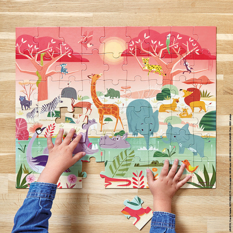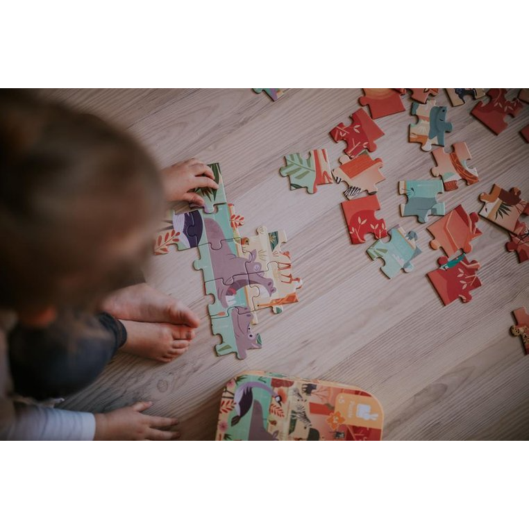 Zestaw puzzli w walizce Rezerwat zwierząt francuskiej marki JANOD składa się z 54 elementów, po ułożeniu tworzących piękny, bogaty w szczegóły obrazek, przedstawiający dzikie zwierzęta na sawannie nad rzeką. Znajdują się tu m.in. słonie, lwy, żyrafa, małpy, nosorożec, hipopotamy oraz krokodyl. Puzzle wykonane są z solidnego kartonu. Zaprojektowane i wyprodukowane we Francji. Zapakowane w estetyczną walizeczkę z rączką. Idealnie nadają się na prezent.