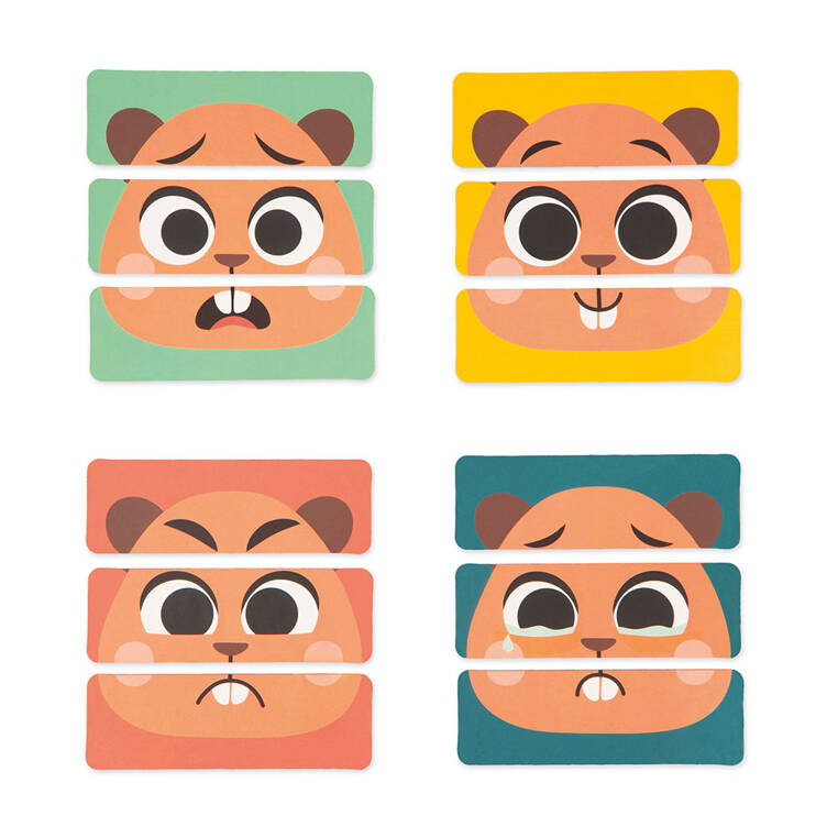 • Układanka emocji – 4 obrazki przedstawiające radość, smutek, strach i złość – pomagają rozmawiać o uczuciach i poszerzają słownictwo