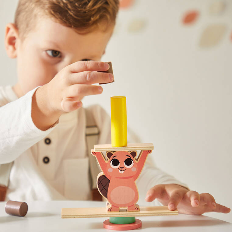 • Zabawka zręcznościowa – bóbr + kostka – ćwiczy precyzję, planowanie i refleks