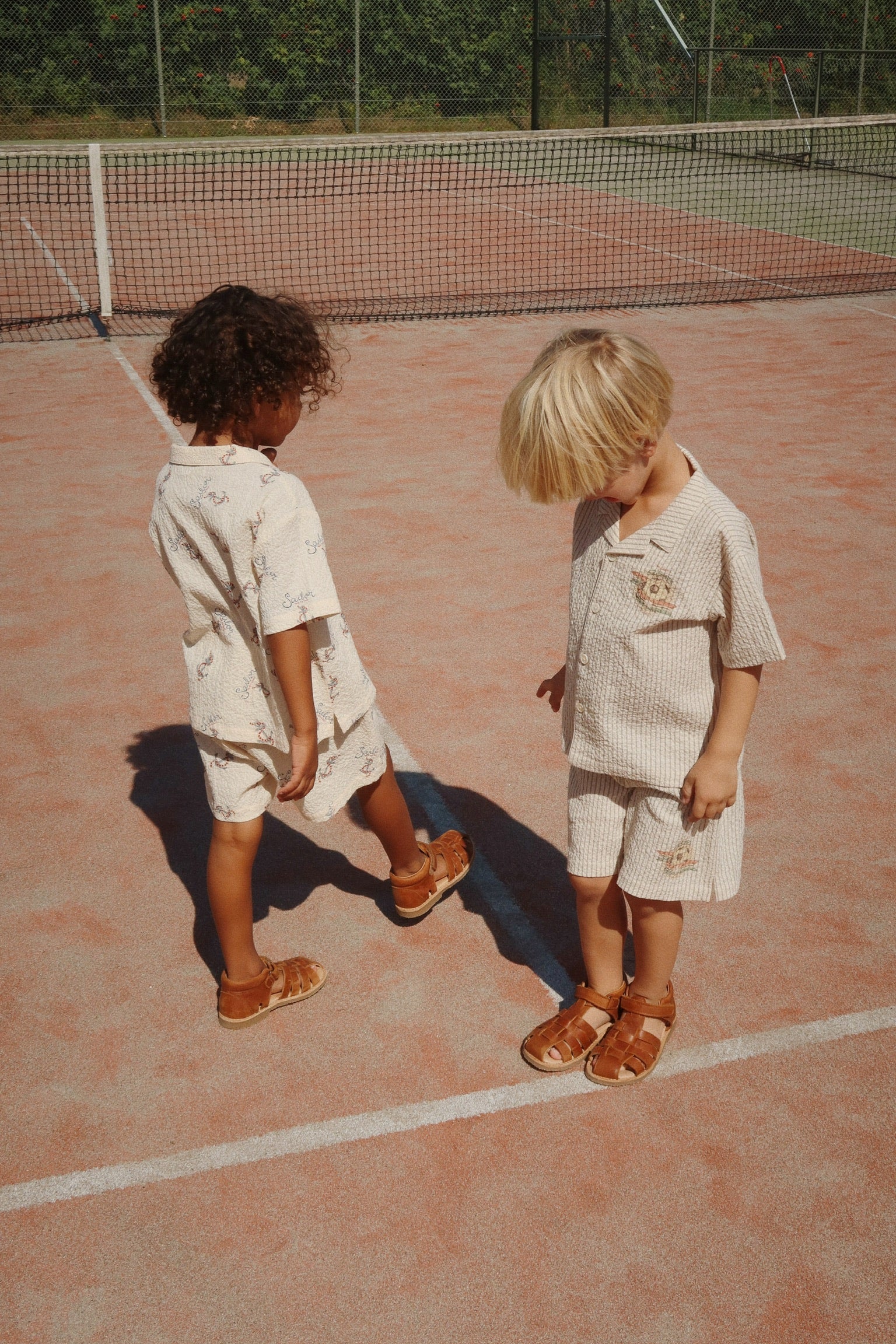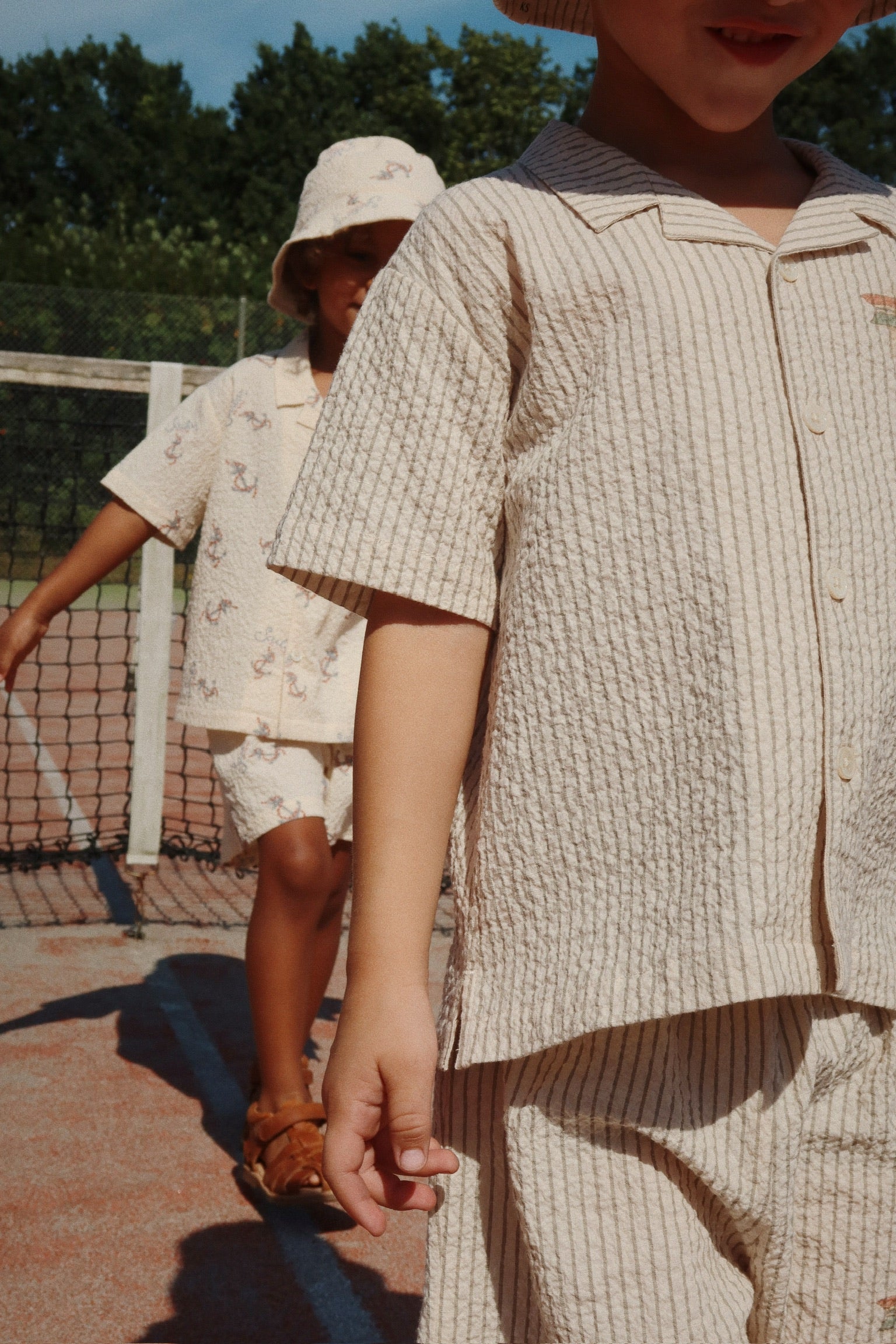 Wygodne szorty wykonane z lekkiej, teksturowanej tkaniny seersucker, idealne na ciepłe dni. Dzięki elastycznemu pasowi zapewniają komfort noszenia i doskonałe dopasowanie. Wykonane z wysokiej jakości organicznej bawełny, są przyjazne dla skóry i środowiska.