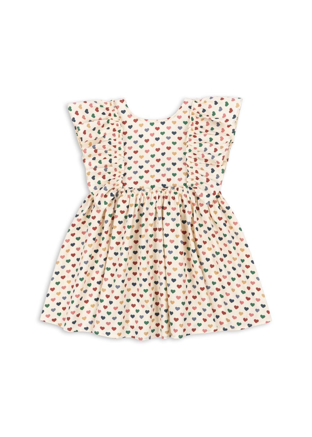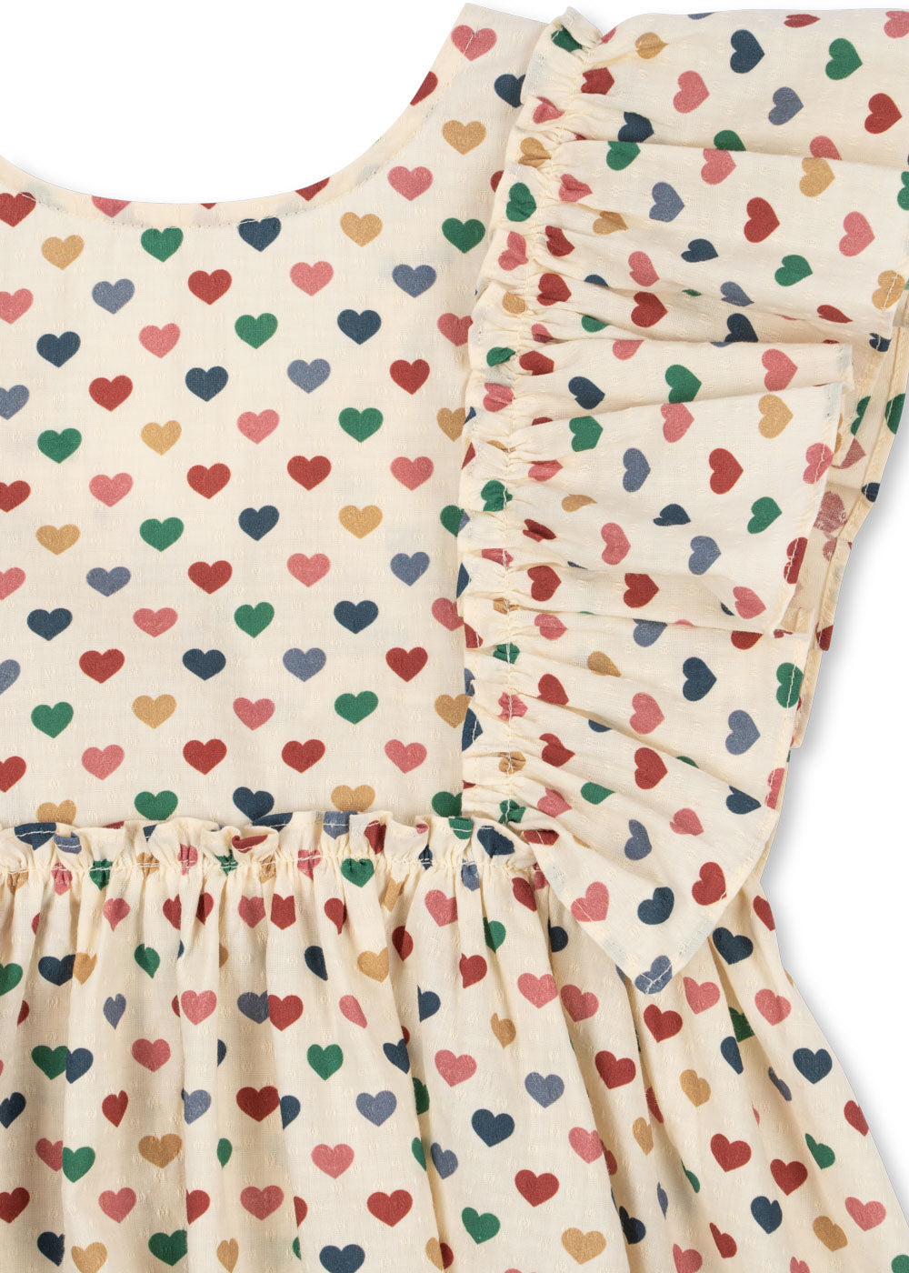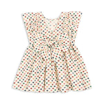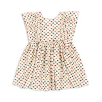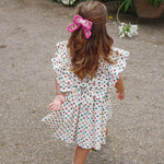 Lekka i urocza sukienka, która łączy elegancję z wygodą. Delikatne falbaniaste rękawy oraz subtelne detale w postaci kokardek nadają jej wyjątkowego uroku. Wykonana w 100% z organicznej bawełny, jest przyjazna dla skóry i oddychająca, co zapewnia komfort noszenia przez cały dzień.