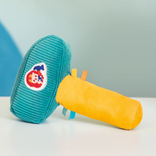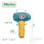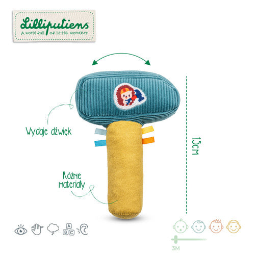 Grzechotka-młotek z kolekcji Jeżyk Leon belgijskiej marki Lilliputiens to wyjątkowa zabawka sensoryczna dla niemowląt. Ma postać miękkiego młotka z uroczym jeżykiem w kasku. Wewnątrz kryje się piszczałka, która przy potrząsaniu wydaje wesoły dźwięk, a różnorodne faktury i detale (m.in. wypustki) dodatkowo stymulują zmysły. Maluch rozwija koordynację i małą motorykę, ćwiczy chwytanie i potrząsanie, a przy tym świetnie się bawi.