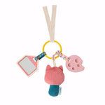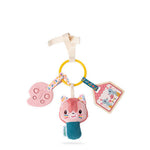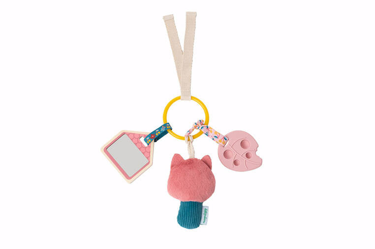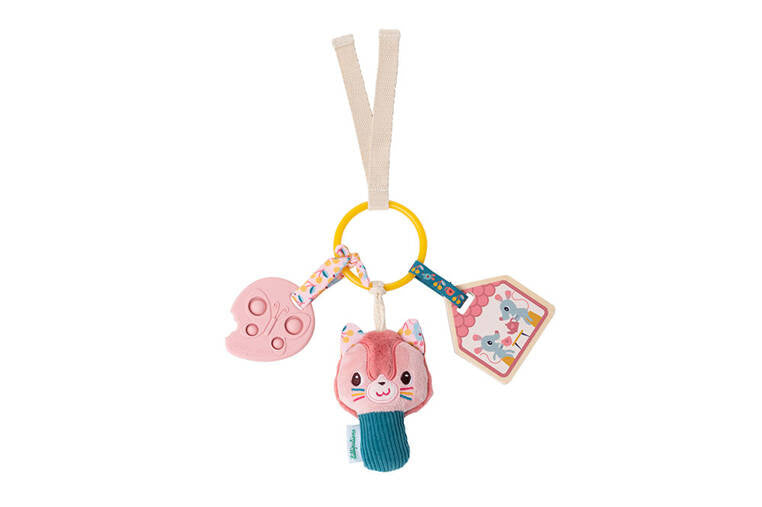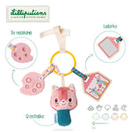 Wielofunkcyjny brelok–zawieszka aktywizująca Kotka Jeanne od belgijskiej marki Lilliputiens to idealna pierwsza zabawka dla maluszka. Na praktycznym kółeczku znajdziesz trzy różnorodne elementy: silikonowy pop-it z motylkiem, grzechotkę z postacią Kotki Jeanne oraz drewniany domek myszki z bezpiecznym lusterkiem. Dzięki szerokiej taśmie mocującej brelok można łatwo przypiąć do wózka, fotelika, nosidełka czy łóżeczka, aby zawsze był pod ręką.