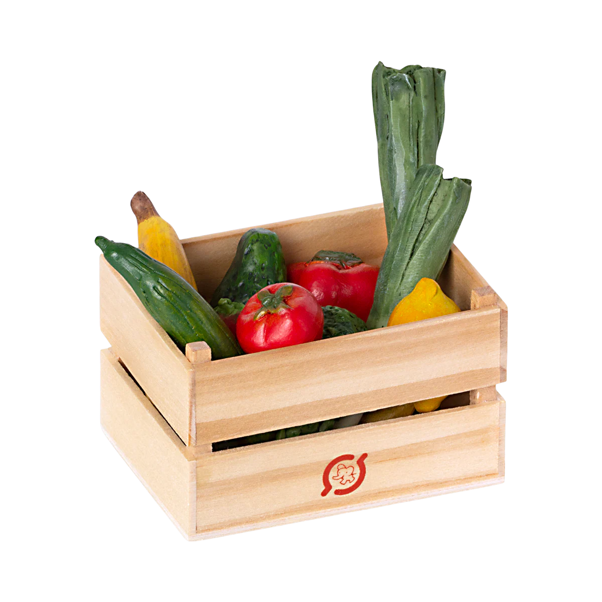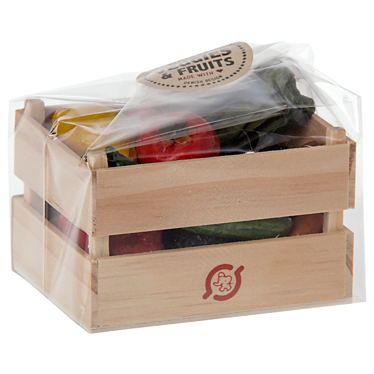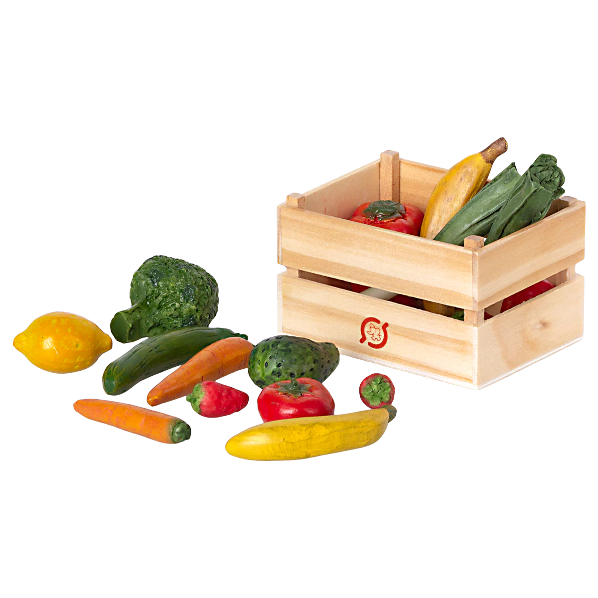 Pamiętaj o warzywach i owocach – mówi każdy lekarz, ale też… każda zabawkowa mama i każdy szef kuchni w domku Maileg! Ten uroczy zestaw składa się z miniaturowych warzyw i owoców zapakowanych w drewnianą skrzynkę. Każdy element został ręcznie pomalowany z niezwykłą dbałością o szczegóły, co sprawia, że zestaw wygląda wyjątkowo realistycznie i stylowo.