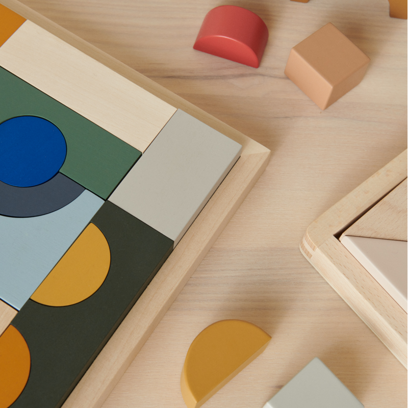 Zabawka Ishan marki Liewood to połączenie drewnianych puzzli i klocków.