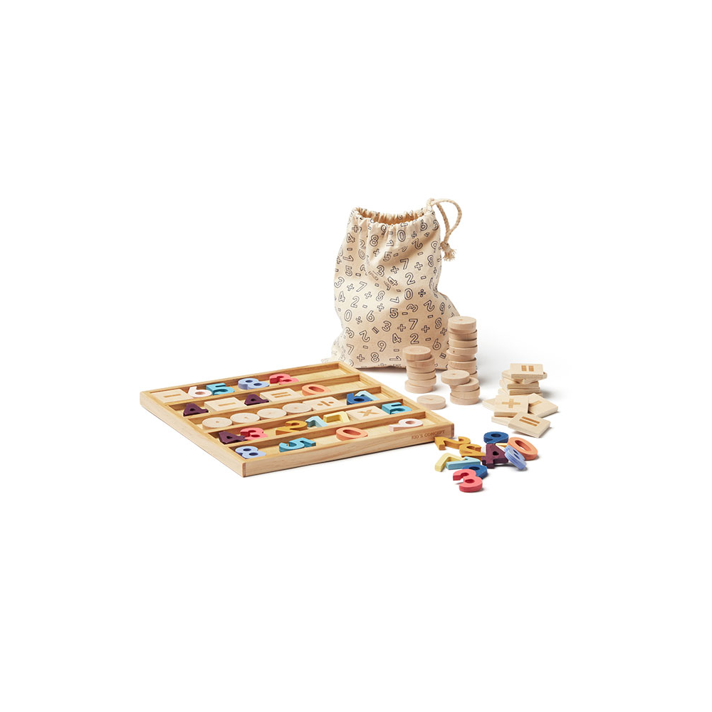 Odwróć tablicę, aby tworzyć wiersze lub kolumny. Zestaw zawiera m.in. 25 klocków w kształcie koła, które mogą symbolizować liczbę pojedynczą, dziesięć lub sto. Kółka pomogą dziecku zrozumieć fizyczny związek między liczbami a rzeczywistą wartością. Są też cyfry i klocki ze znakami dzielenia, dodawania, odejmowania i mnożenia. Zabawka wykonana z drewna z certyfikatem FSC. Klocki można przechowywać w tekstylnej torbie.