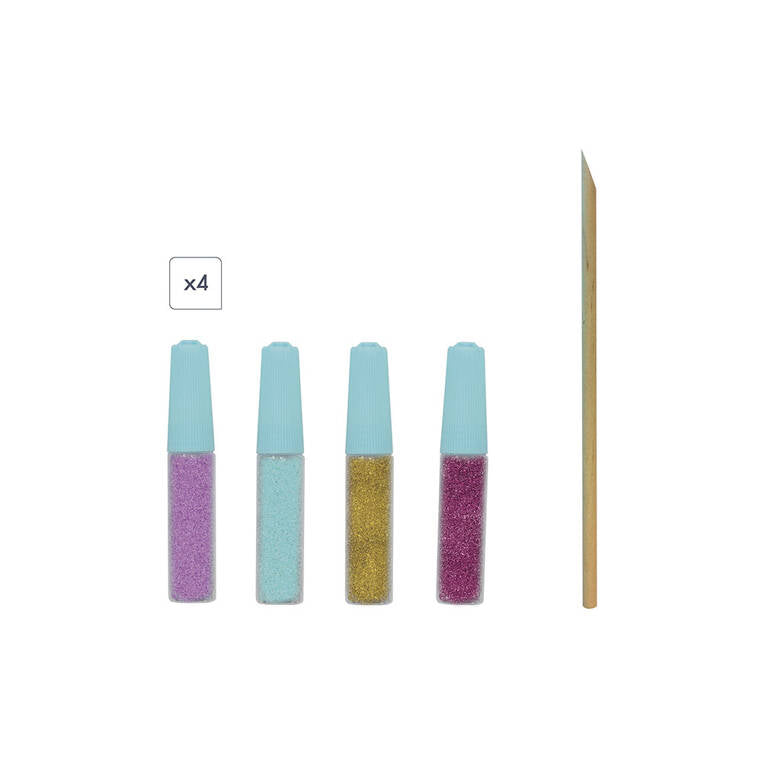 Zestaw kreatywny Brokat i piasek Zwierzęta francuskiej marki JANOD zawiera 5 plansz-obrazków z dzikim kotem, jednorożcem, meduzami, sową i papugą. Ilustracje należy w wyznaczonych miejscach posypać dołączonym do zestawu brokatem (złotym lub różowym) oraz piaskiem (różowym lub niebieskim) w tubkach. Brokat i piasek przyklejają się do obrazków, pozostawiając na nich drobnoziarnistą strukturę. W komplecie znajduje się też drewniany patyczek do wcześniejszego odkrywania powierzchni, przeznaczonych do ozdabiania. Takie zdobienie to dla dziecka godziny angażującej i jednocześnie uspokajającej, wyciszającej zabawy, a gotowe obrazki staną się wspaniałą dekoracją dziecięcego pokoju lub prezentem dla kogoś bliskiego. Zestaw zaprojektowano we Francji we współpracy z francuską grupą mediową i wydawniczą Hachette. Zapakowany jest w stylowe kartonowe pudełko. Idealnie nadaje się na prezent.