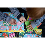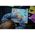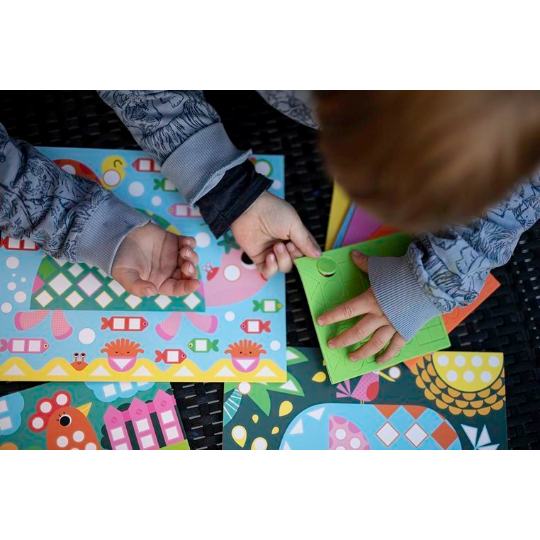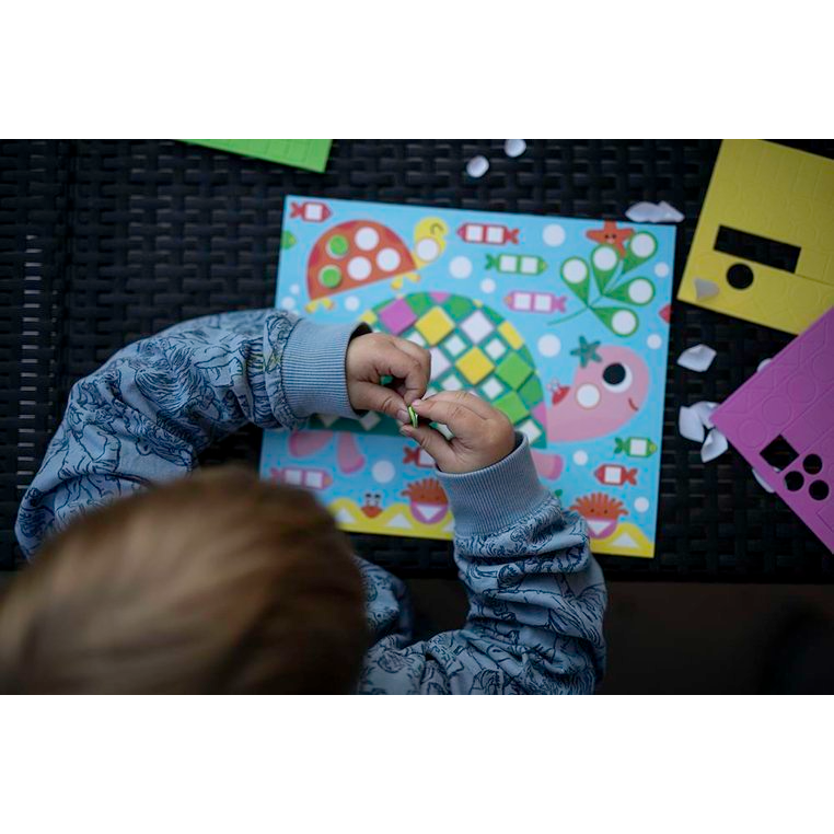 Zestaw kreatywny Mozaika Zwierzęta francuskiej marki JANOD zawiera 3 kartonowe plansze-obrazki, które przedstawiają sympatyczne zwierzęta, m.in. kwokę z kurczaczkami czy słonia w towarzystwie myszki i ptaszka. Do ilustracji tych można – zarówno w sugerowanych miejscach, jak i dowolnie – przyklejać dołączone do zestawu sporych rozmiarów piankowe naklejki w różnych geometrycznych kształtach, tj. kwadratowe, okrągłe i trójkątne (ponad 240 sztuk!) oraz w 6 różnych kolorach (każdy na osobnym arkuszu). Naklejanie to dla dziecka długie godziny angażującej i jednocześnie uspokajającej, wyciszającej zabawy, a gotowe obrazki staną się wspaniałym elementem dekoracyjnym dziecięcego pokoju.
