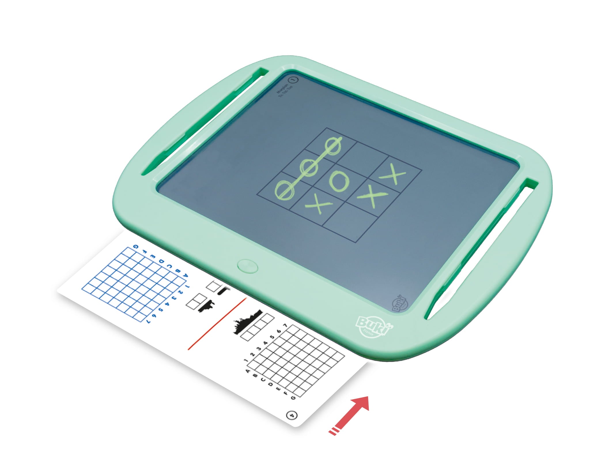 Tablet z ekranem LCD do grania w gry podróżne: samemu lub w parach. Włóż kartę z wybraną grą pod wyświetlacz, aby zagrać w takie gry jakkółko i krzyżyk, wisielec, statki, sudoku i inne. Do wyboru aż 20 różnych gier! Rozwiązania zaznacza się pisząc po ekranie specjalnymi rysikami dołączonymi do zestawu. Po zakończeniu wystarczy kliknąć przycisk, aby wymazać zapiski. Mały guzik z tyłu tabletu blokuje ekran, gdy chcemy zachować notatki na dłużej lub zrobić przerwę.