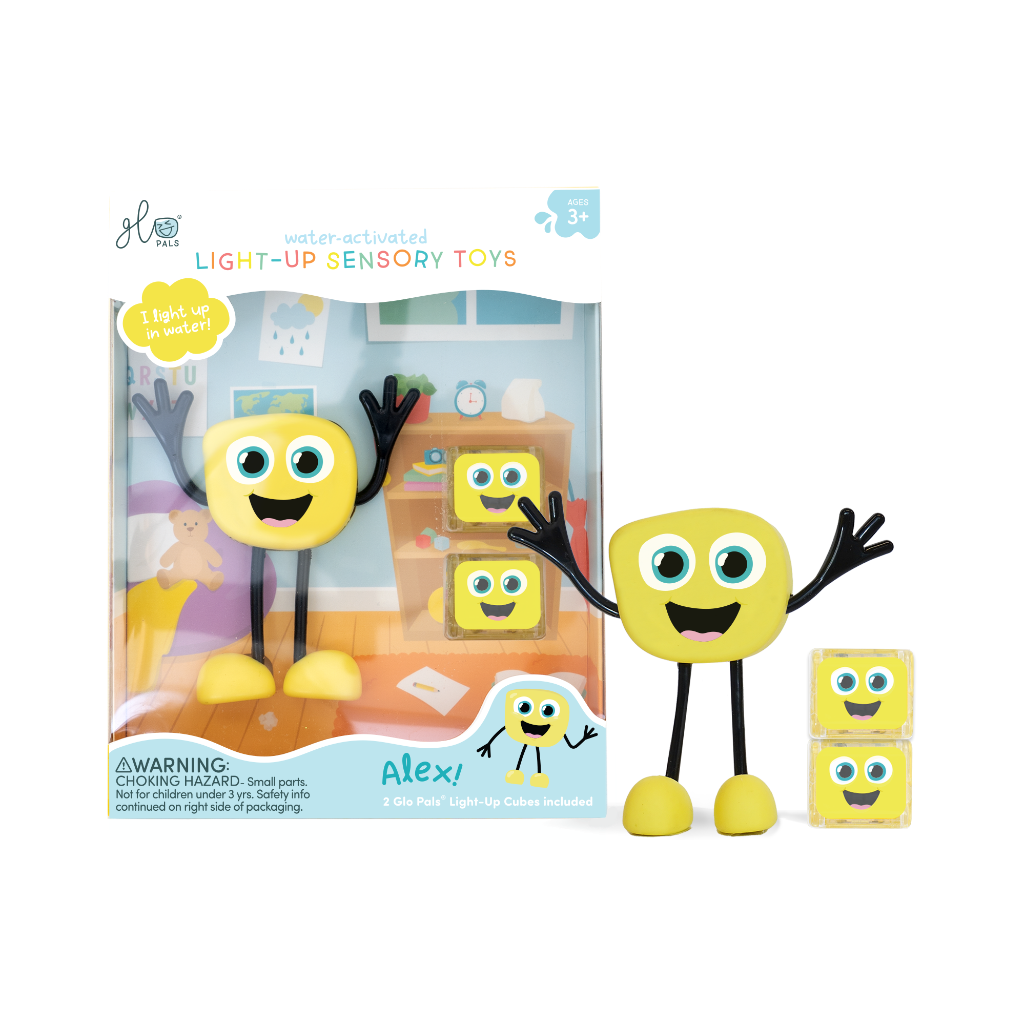 Glo Pals - Postać do kąpieli Alex - zestaw z dwiema kostkami sensorycznymi świecącymi w wodzie