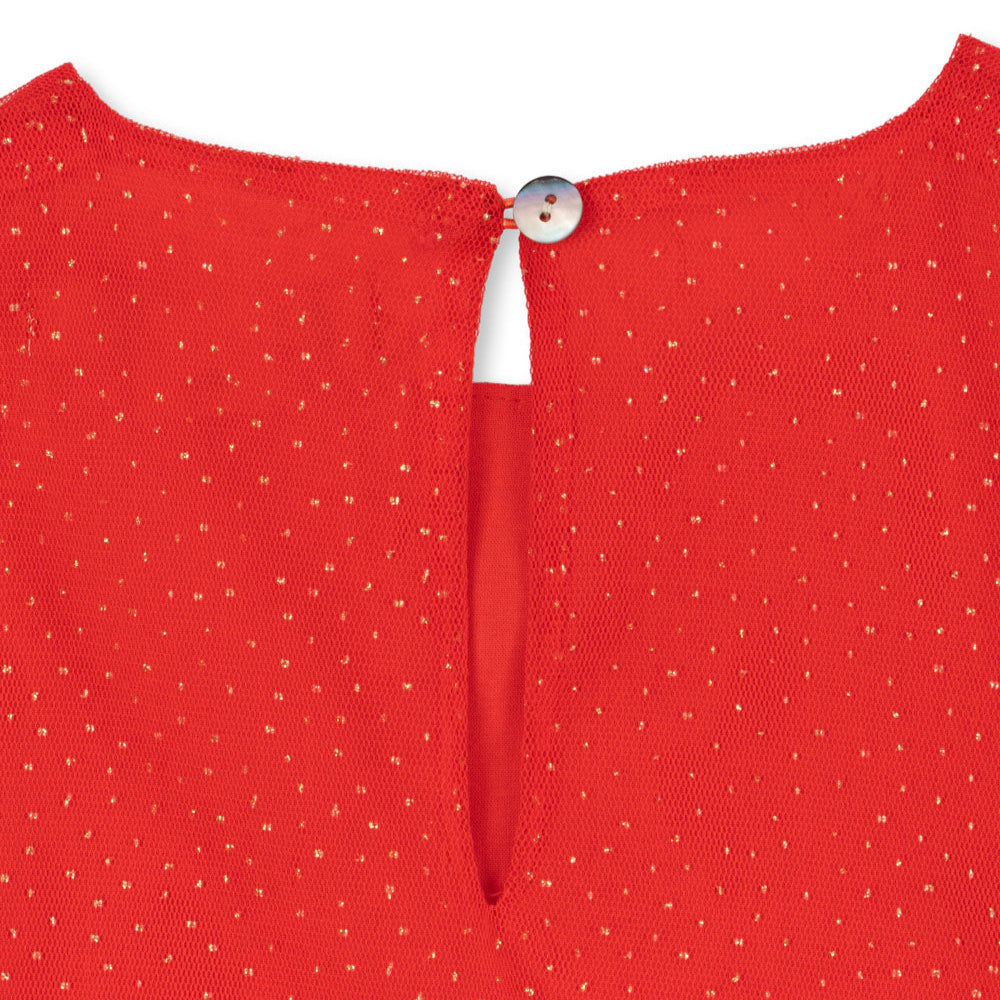 Ta wyjątkowa tiulowa sukienka to idealna propozycja na świąteczne i uroczyste okazje. Została zaprojektowana z pięknymi, bufiastymi rękawkami oraz pełną, warstwową spódnicą, która efektownie układa się przy każdym ruchu. Eleganckie detale sprawiają, że sukienka ma odświętny i ponadczasowy charakter, a bawełniana podszewka zapewnia komfort noszenia nawet przez wiele godzin.