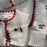 Sweterek Collette to kwintesencja dziewczęcej elegancji i wygody. Uszyty z 100% miękkiej wełny, otuli ciepłem w chłodniejsze dni, a jednocześnie pozostanie lekki i przewiewny. Delikatny haft wisienek oraz kontrastowe wykończenie przy krawędziach nadają mu wyjątkowego uroku. Sweterek zapinany jest z przodu na guziczki z masy perłowej, które podkreślają jego ponadczasowy charakter.