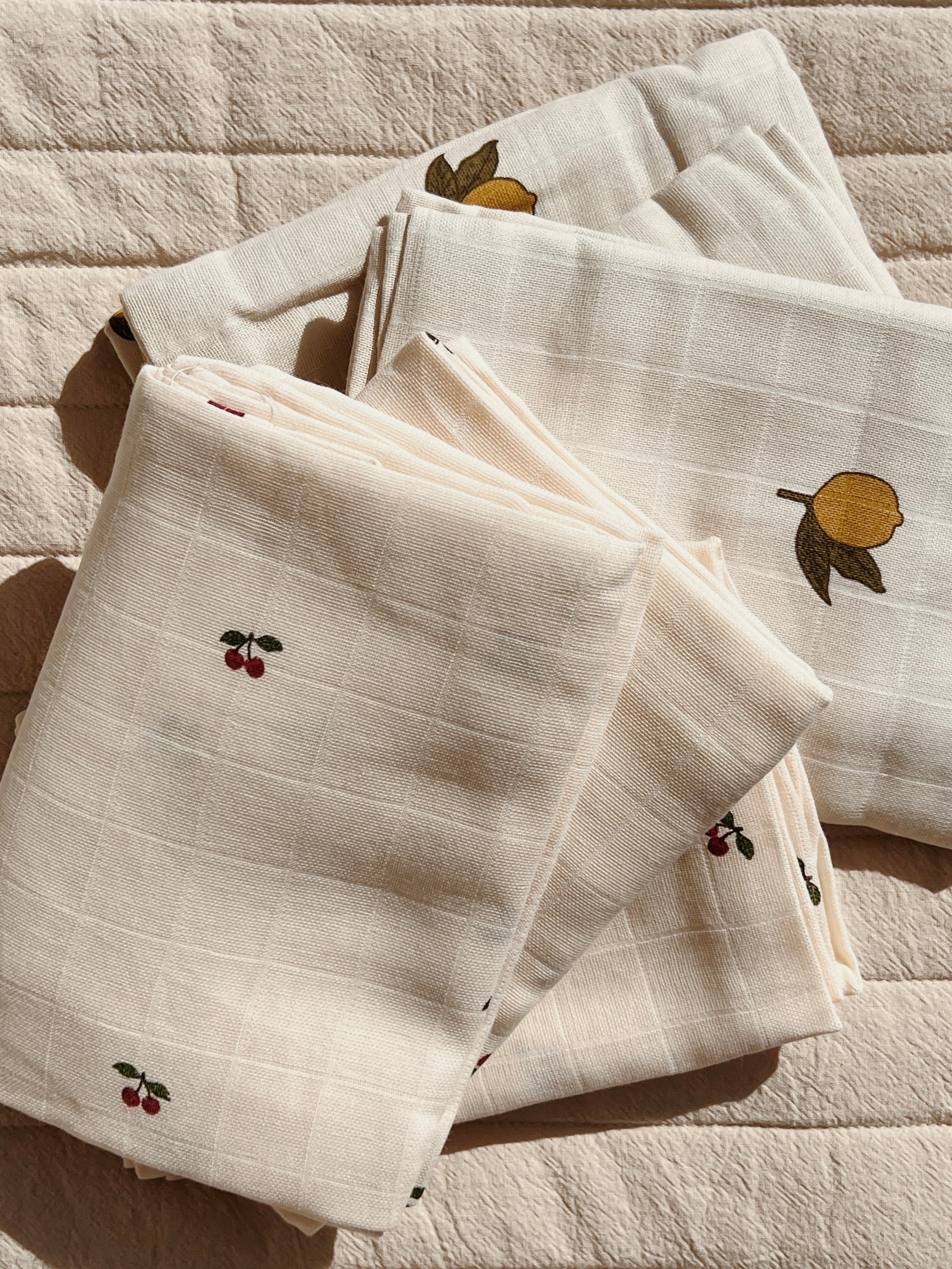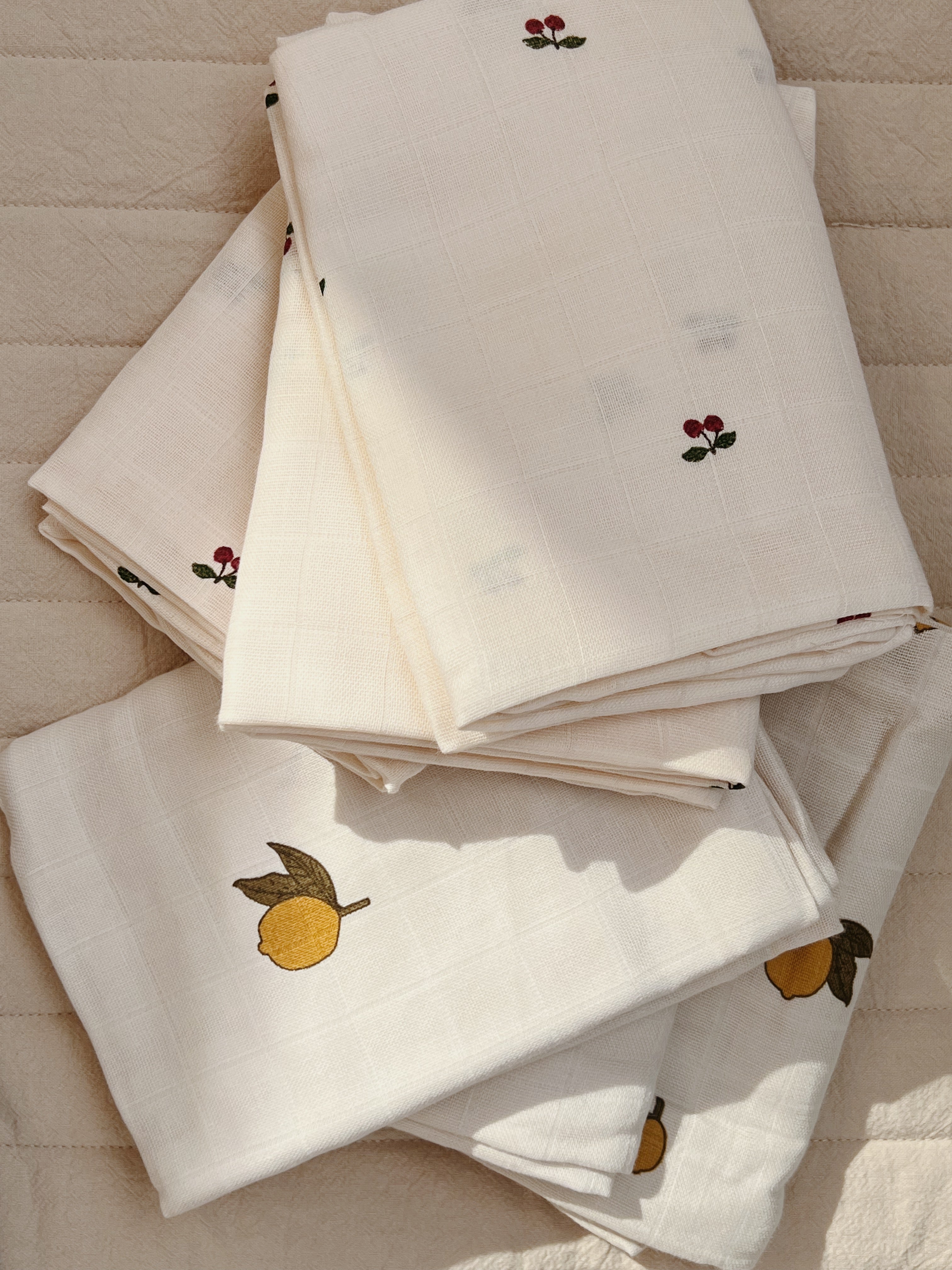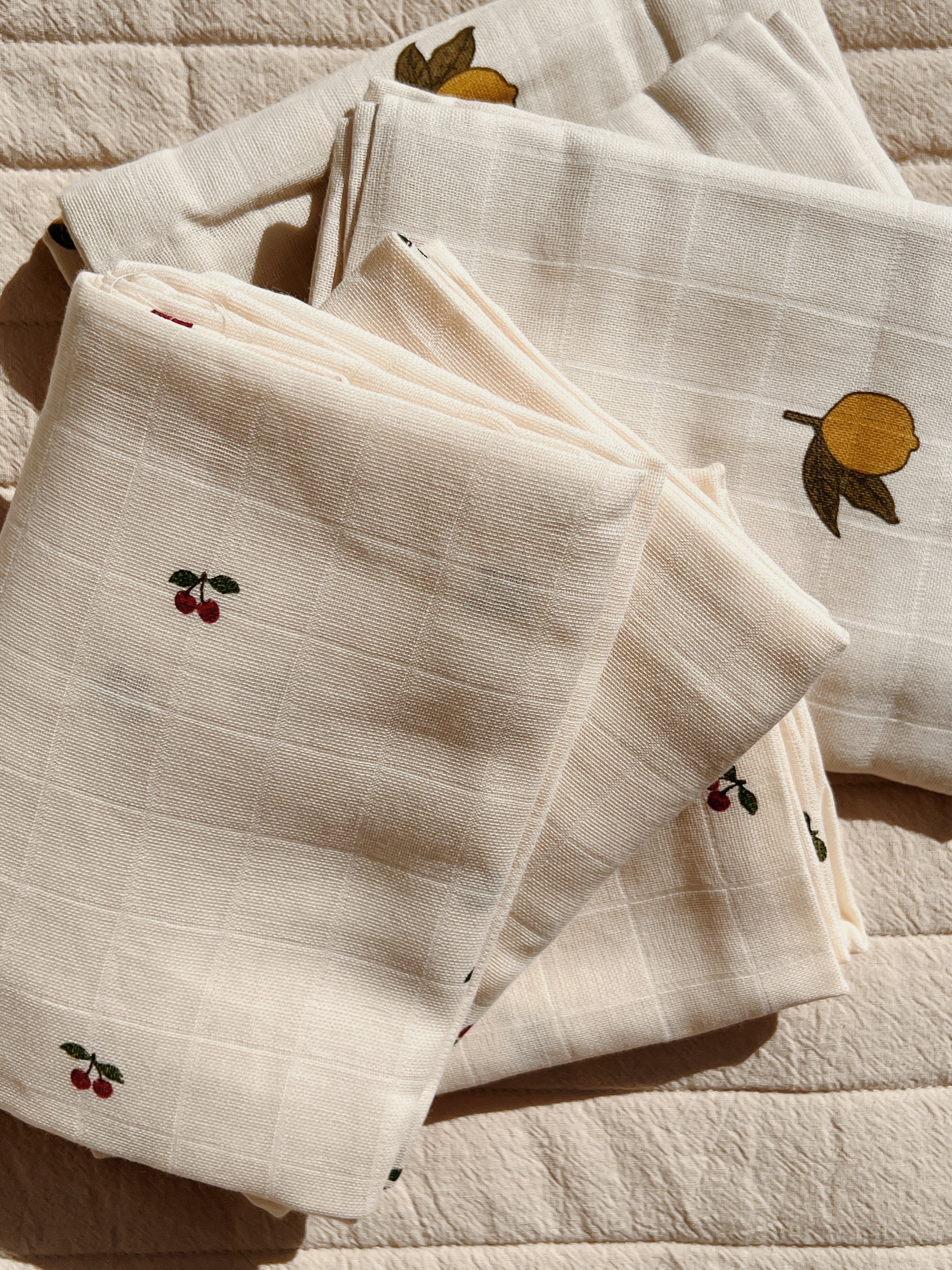 Pieluszki muślinowe w pakiecie 3 sztuk są niezwykle wszechstronne: można je używać podczas karmienia, przy jedzeniu dziecka, lub jako lekki kocyk do spania.