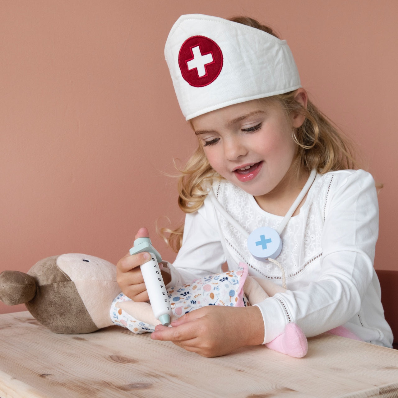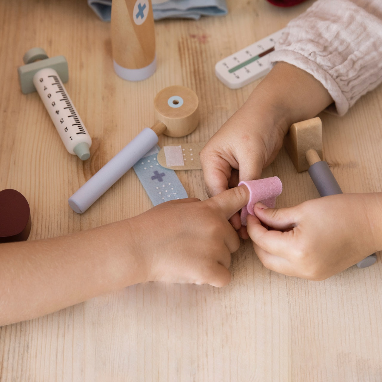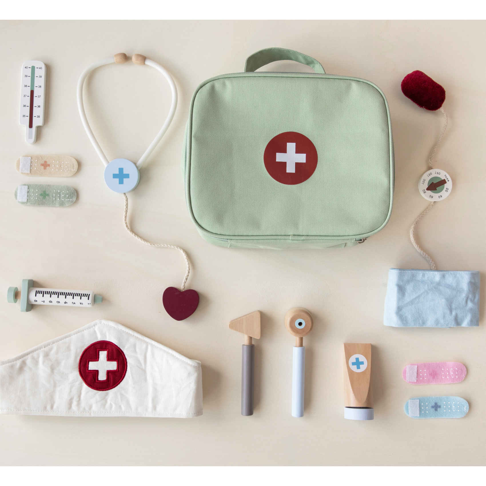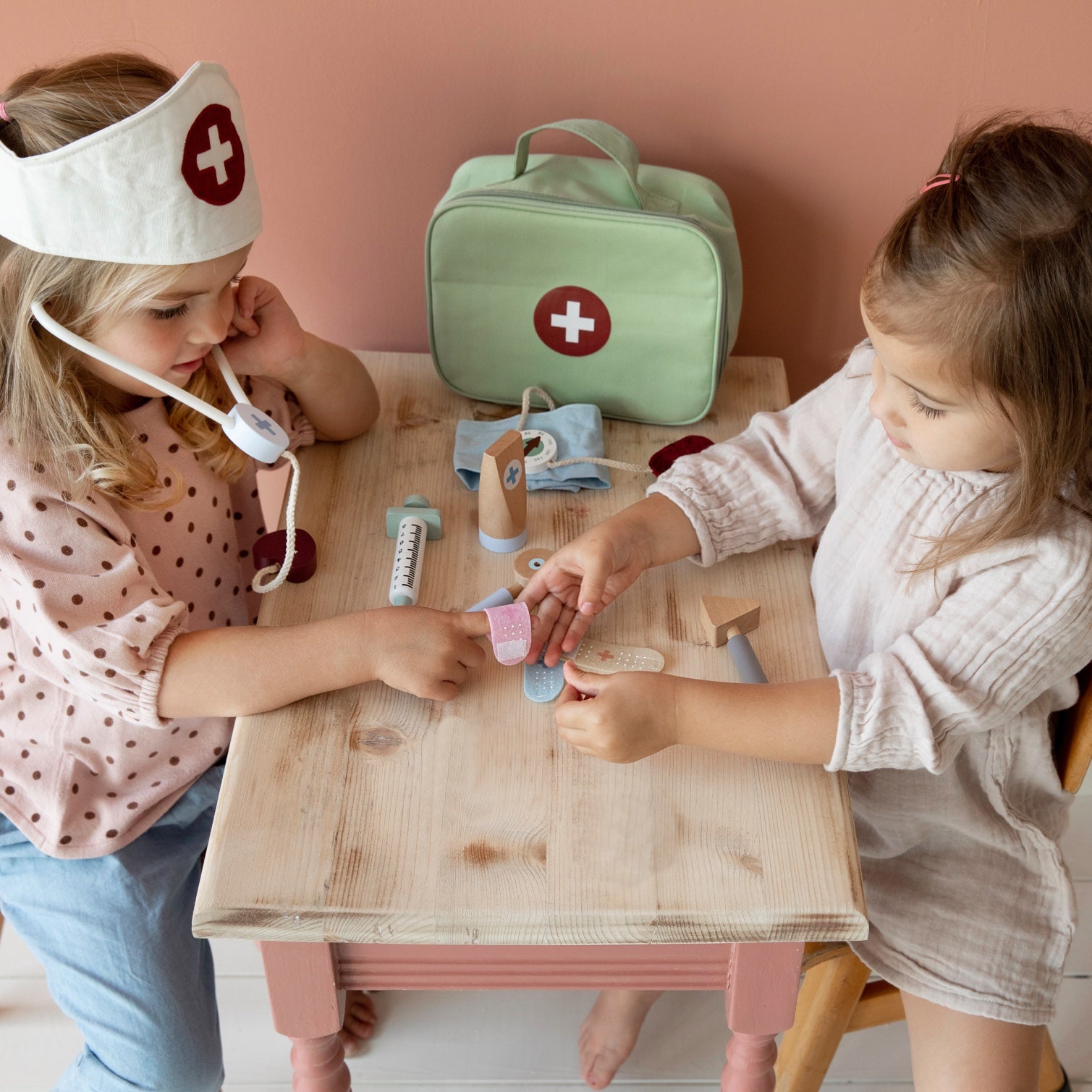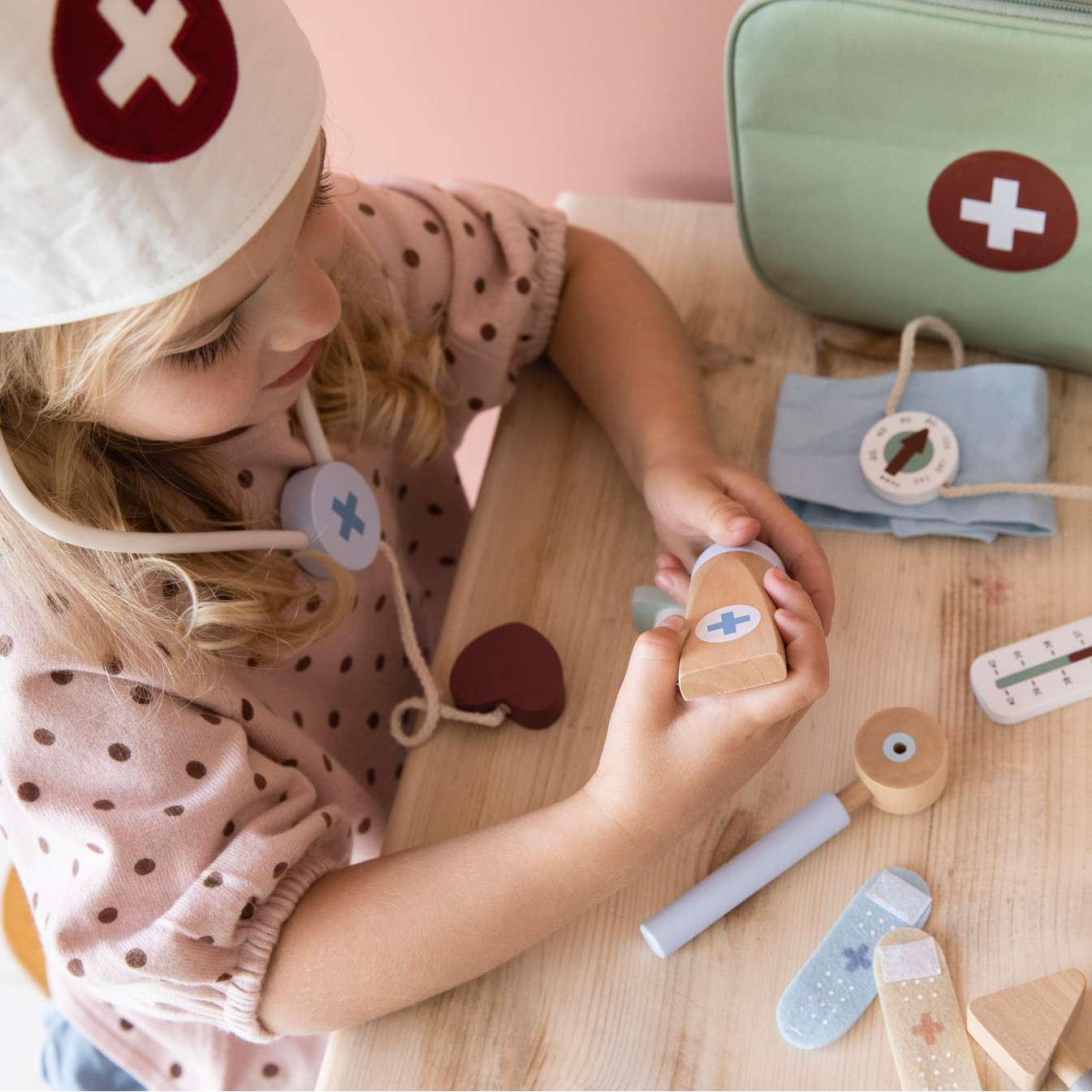 Zestaw lekarski do zabawy dla dzieci to fantastyczny pomysł na ciekawe zabawy, które dzieci uwielbiają. Zestaw zapakowany jest w bardzo ładną kosmetyczkę-walizeczkę, a w środku znajdziemy 4 plastry, termometr, strzykawka, tubka maści, stetoskop, młotek refleksyjny, ciśnieniomierz, otoskop i czapka lekarska. Bardzo duży i ciekawy zestaw, zapewni długie godziny tak uwielbianej przez dzieci zabawy jak ta w lekarza.