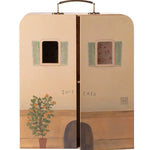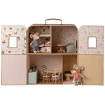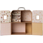 SuitCasa otwiera się jak mała walizka i tworzy dwupoziomowy domek pełen możliwości aranżacji. Można w nim ustawić wiele miniaturowych mebelków Maileg – kuchnię, łóżeczka, stoliki, kanapy i akcesoria – tworząc w pełni wyposażony myszy dom.